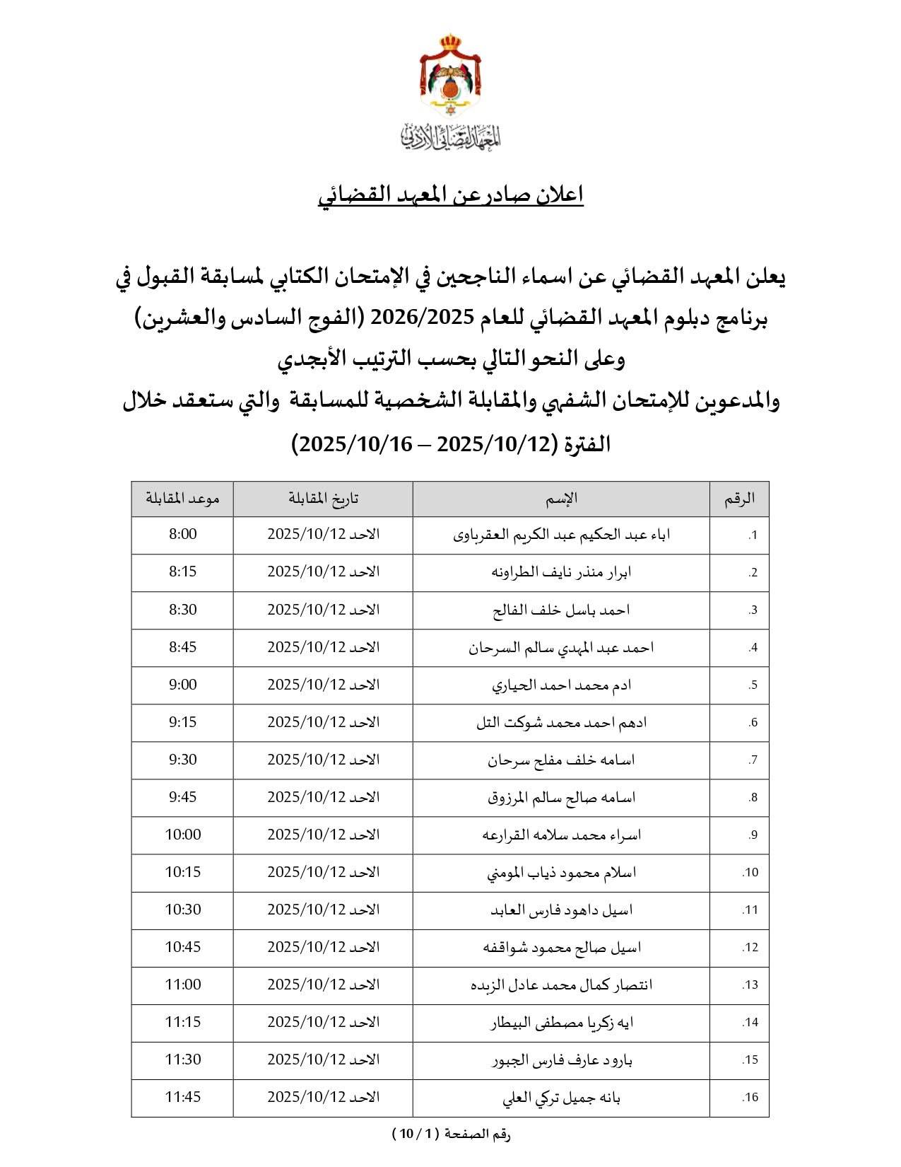 أعلن المعهد القضائي عن اسماء الناجحين في الإمتحان الكتابي لمسابقة القبول في برنامج دبلوم المعهد القضائي للعام 2025/2026 ، (الفوج السادس والعشرين)، وعلى النحو التالي بحسب الترتيب الأبجدي .