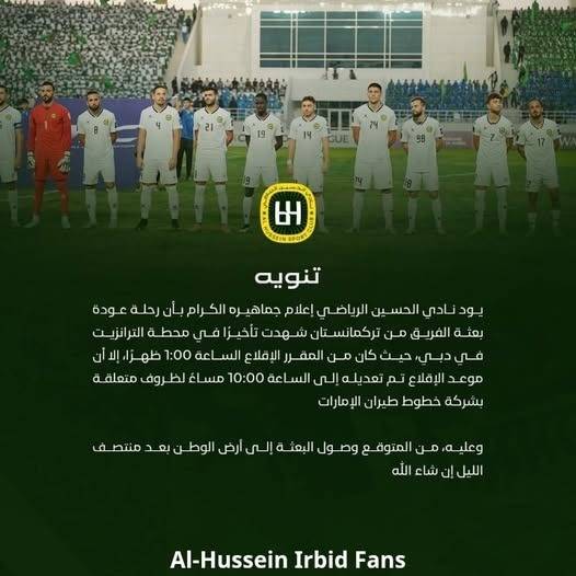 كشف مصدر أن الطائرة المقررة نقل فريق الحسين إربد من إمارة دبي الإماراتية إلى عمان، تعطلت بسبب انفجار في العجلات الخلفية للطائرة لحظة إقلاعها.