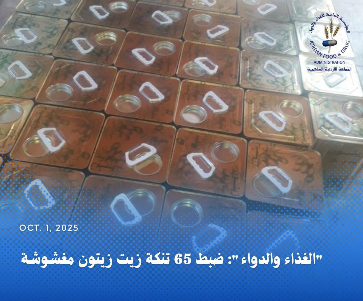ضبطت المؤسسة العامة للغذاء والدواء، بالتعاون مع الإدارة الملكية لحماية البيئة، 65 تنكة من زيت الزيتون المغشوش في إربد.