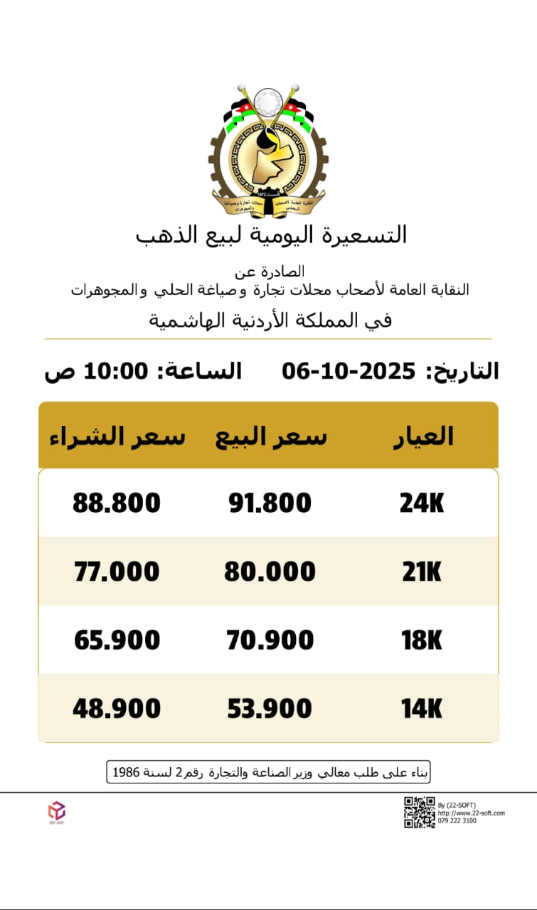 ووفقًا للنشرة اليومية الصادرة عن النقابة العامة لأصحاب محلات تجارة وصياغة الحلي والمجوهرات، فقد ارتفع سعر الغرام الواحد من الذهب لعيارات 24 و18 و14 إلى 91.80 دينارًا و70.90 دينارًا و53.90 دينارًا على التوالي، لغايات البيع من محلات الصياغة.