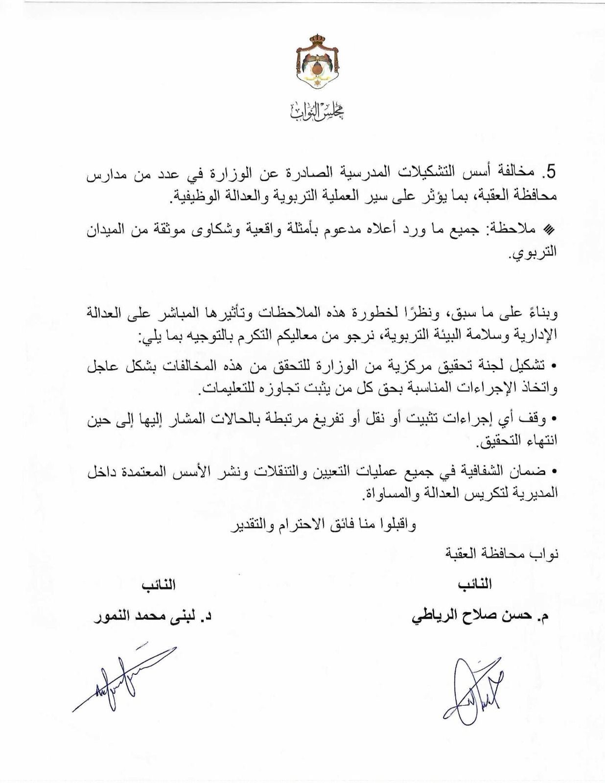 وجه النائبان المهندس حسن الرياطي والدكتورة لبنى النمور سؤالاً نيابياً إلى وزير التربية والتعليم، طالبا فيه بفتح تحقيق عاجل حول ما وصفاه بـ"تجاوزات ومخالفات إدارية" في مديرية التربية والتعليم في محافظة العقبة، تتعلق بتعيين المساعدين والتنقلات داخل المدارس.