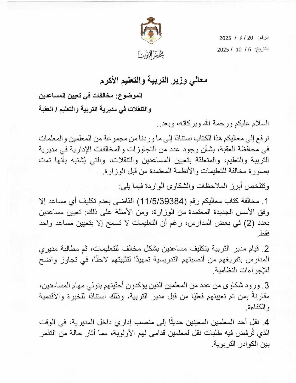 وأشار النائبان في سؤالهما إلى ورود شكاوى من معلمين ومعلمات في المحافظة، تفيد بوجود تعيينات لمساعدين بصورة مخالفة للتعليمات والأنظمة المعتمدة من الوزارة، من بينها تكليف أكثر من مساعد في المدرسة الواحدة خلافاً للتعليمات، وتفريغ بعض المساعدين من أنصبتهم التدريسية تمهيدًا لتثبيتهم لاحقاً دون وجه حق.