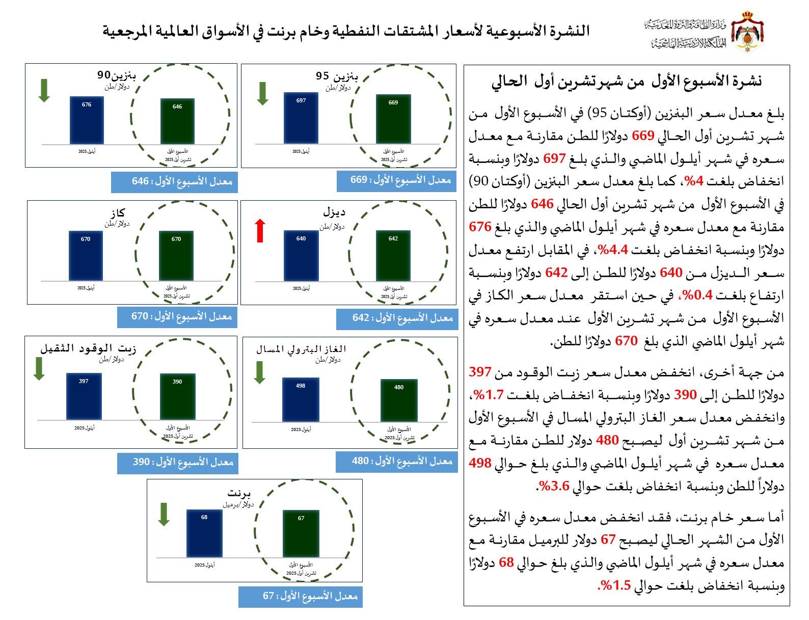 تالياً النشرة الأسبوعية لأسعار النفط الخام برنت ومشتقاته حسب الأسواق المرجعية للأسبوع الأول من شهر تشرين أول 2025
