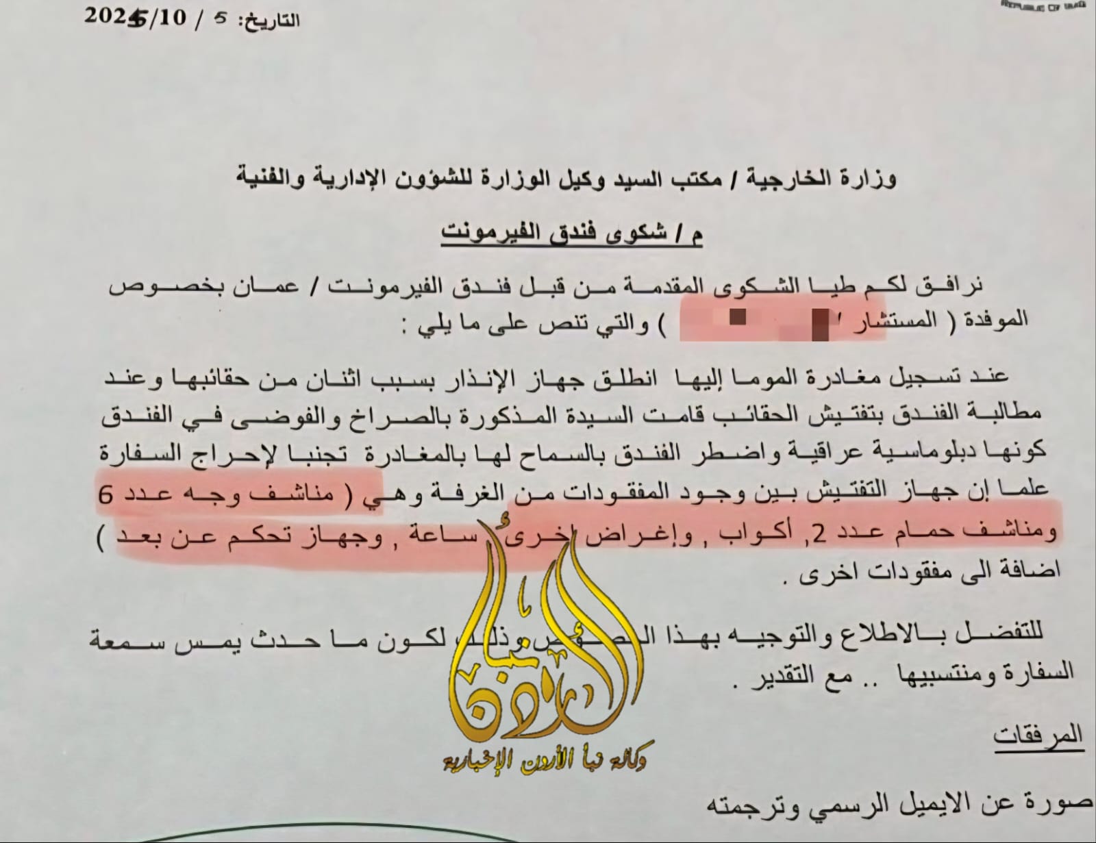 تقدّم فندق الفيرمونت في العاصمة عمان، بشكوى رسمية ضد دبلوماسية "عربية"، اتهمها بسرقة مقتنيات من الغرفة التي كانت تقيم فيها، منها مناشف وساعة وجهاز تحكم عن بعد واغراض اخرى.