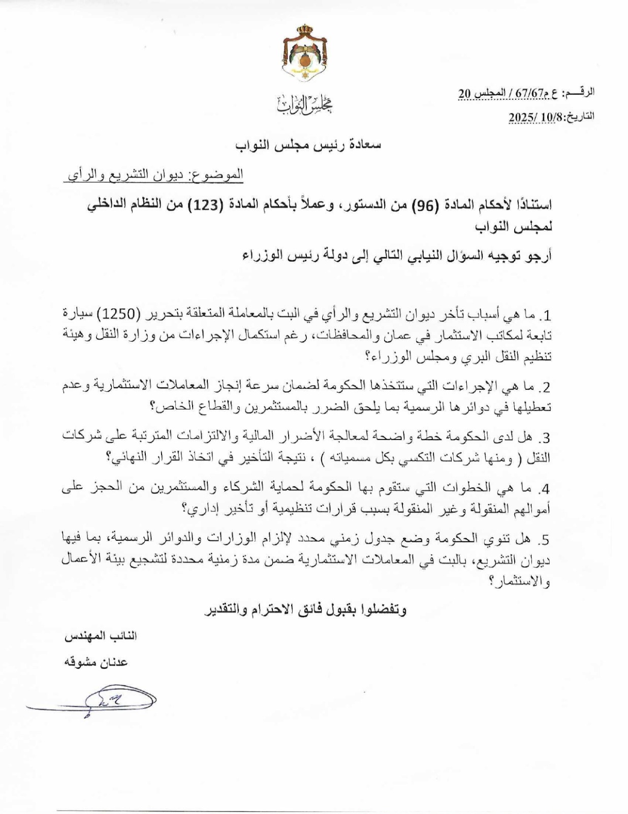 وجّه النائب المهندس عدنان مشوقة سؤالاً نيابياً إلى رئيس الوزراء، استنادًا لأحكام المادة (96) من الدستور، حول أسباب تأخر ديوان التشريع والرأي في إنجاز بعض المعاملات القانونية والإجرائية، ولا سيّما معاملة تحرير سيارة تابعة لمكتب الاستقبال في عمان والمحافظات، رغم استكمال وزارة النقل وهيئة تنظيم النقل البري لكافة الإجراءات اللازمة.