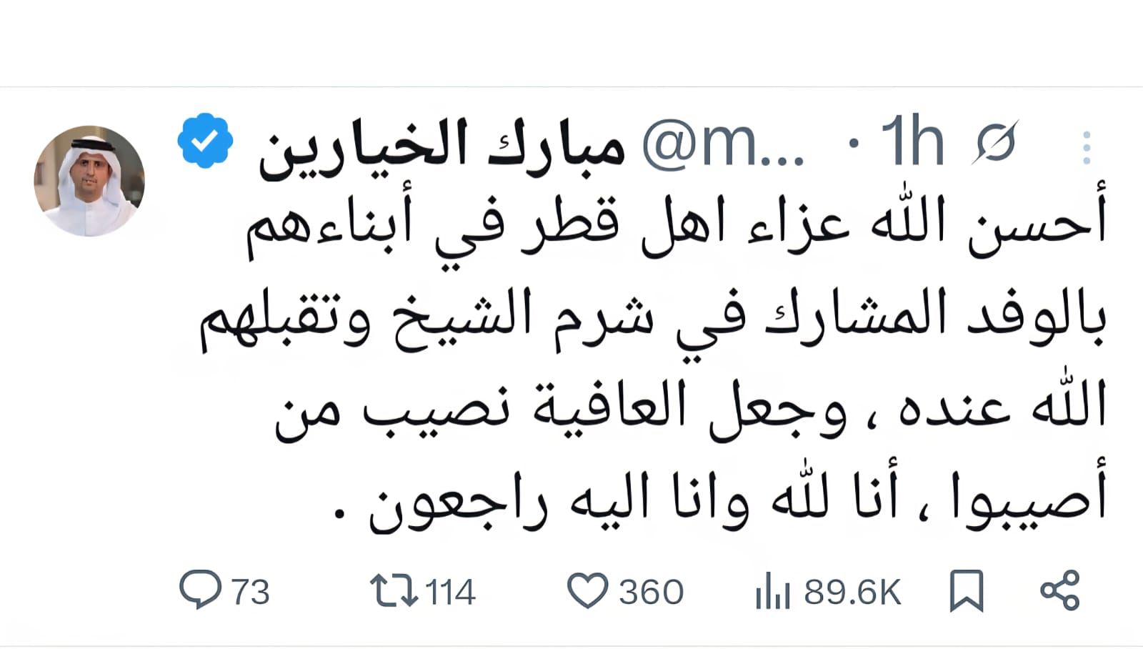 وفي منشور عبر حسابه على موقع "إكس” اليوم الأحد، عبر عضو رابطة مجلس قطر للقيادات، مبارك الخيارين، عن حزنه الشديد، قائلاً: "أحسن الله عزاء أهل قطر في أبناءهم بالوفد المشارك في شرم الشيخ وتقبلهم الله عنده، وجعل العافية نصيب من أصيبوا، إنا لله وإنا إليه راجعون”. وأثار المنشور تفاعلاً واسعاً، معبراً عن الروابط الأسرية والاجتماعية الوثيقة بين الضحايا والمجتمع القطري.