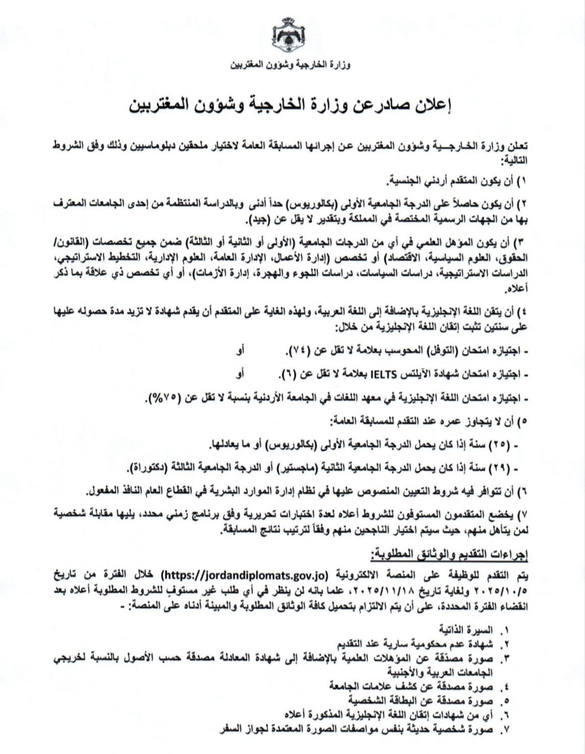أعلنت وزارة الخارجية وشؤون المغتربين عن اجرائها المسابقة العامة لاختيار ملحقين دبلوماسيين وذلك وفق الشروط .
