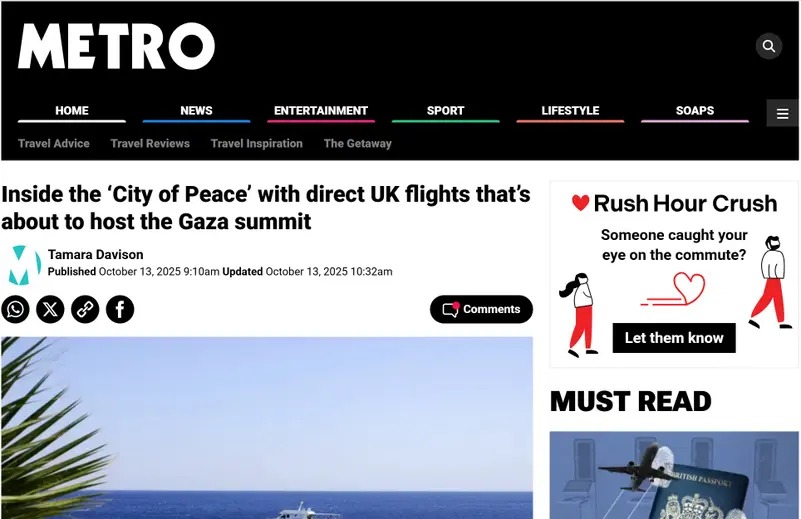 وصفت جريدة "مترو" البريطانية مدينة شرم الشيخ المصرية بأنها "مدينة السلام"، ونصحت البريطانيين بزيارتها، وقالت إن الرحلات المباشرة من مدن بريطانيا إلى هناك متوفرة بشكل يومي لنقل السياح إلى هذه "الوجهة السياحية ذات الأهمية البالغة".