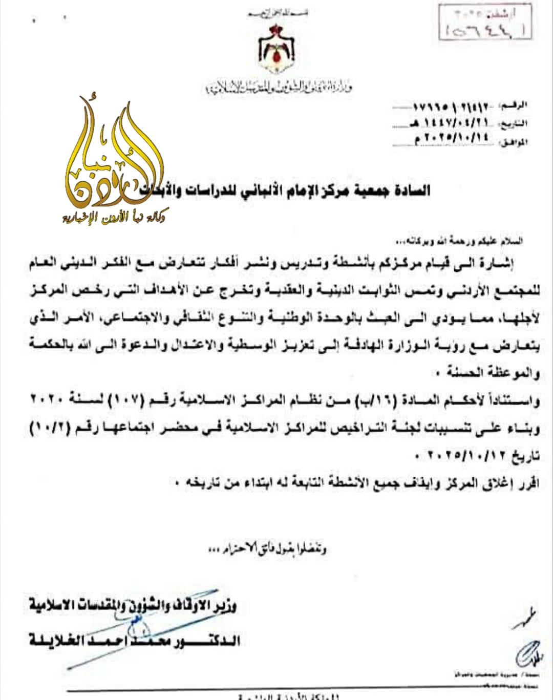 قال الناطق باسم وزارة الاوقاف والشؤون والمقدسات الإسلامية الدكتور علي الدقامسة، أنّ الوزير محمد الخلايلة أصدر قرارًا بإغلاق جمعية مركز الإمام الألباني للدراسات والأبحاث.