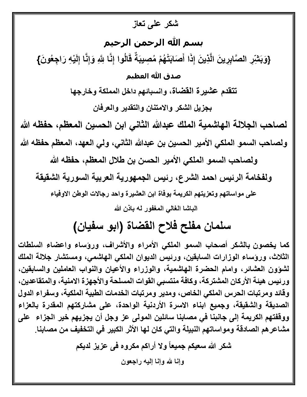 لصاحب الجلالة الهاشمية الملك عبدالله الثاني ابن الحسين المعظم، حفظه اللّٰه ولصاحب السمو الملكي الأمير الحسين بن عبدالله الثاني، ولي العهد، المعظم حفظه اللّٰه ولصاحب السمو الملكي الأمير الحسن بن طلال المعظم، حفظه اللّٰه ولفخامة الرئيس احمد الشرع، رئيس الجمهورية العربية السورية الشقيقة على مواساتهم وتعزيتهم الكريمة بوفاة ابن العشيرة واحد رجالات الوطن الاوفياء الباشا الغالي المغفور له باذن اللّٰه