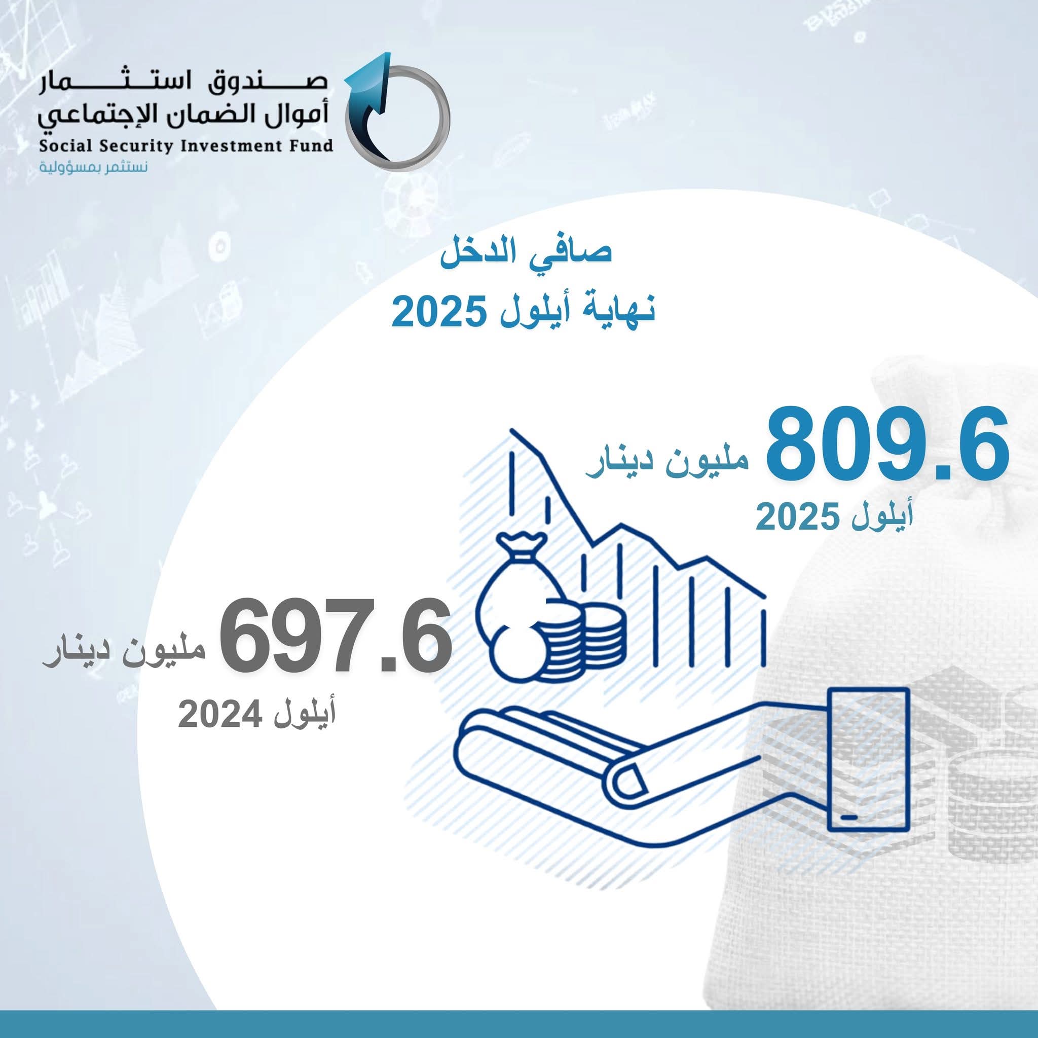 وجاء هذا النمو نتيجة ارتفاع الدخل الشامل ليصل إلى قرابة 1.6 مليار دينار، مقارنة مع 664.5 مليون دينار لنفس الفترة من العام الماضي، وبنسبة نمو بلغت 133.5%، بالإضافة إلى الفائض التأميني المحول من المؤسسة العامة للضمان الاجتماعي والبالغ حوالي 164 مليون دينار. ويمثل الدخل الشامل صافي دخل الصندوق بقيمة حوالي 809.6 مليون دينار، وصافي ارتفاع تقييم محفظة الأسهم الاستراتيجية بحوالي 741.7 مليون دينار.