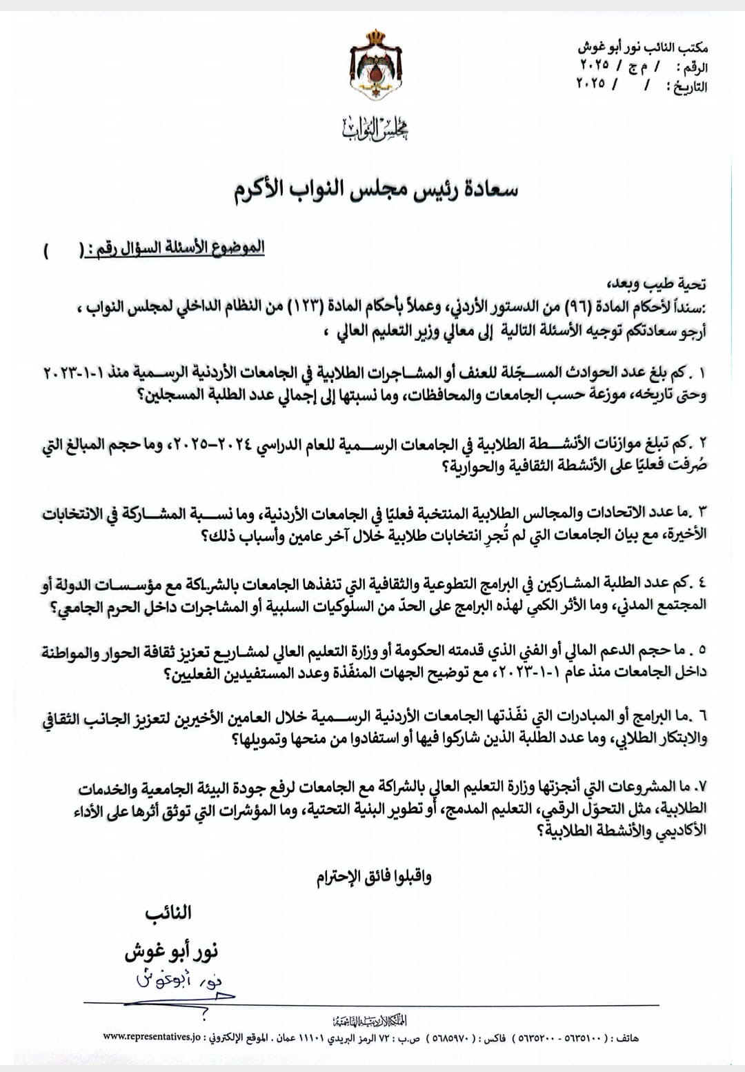 قدمت النائب نور أبو غوش سؤالاً نيابياً إلى معالي وزير التعليم العالي والبحث العلمي، استناداً لأحكام المادة (96) من الدستور الأردني، وعملاً بأحكام المادة (133) من النظام الداخلي لمجلس النواب، حول واقع الأنشطة الطلابية والبيئة الجامعية في الجامعات الأردنية الرسمية.