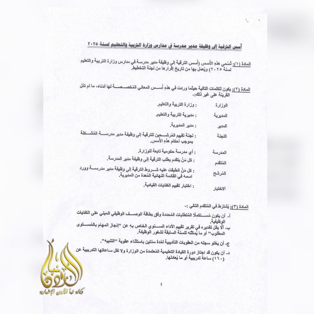 أقرت وزارة التربية والتعليم أسس الترقية الى وظيفة مدير مدرسة في مدارس التربية والتعليم لسنة 2025.