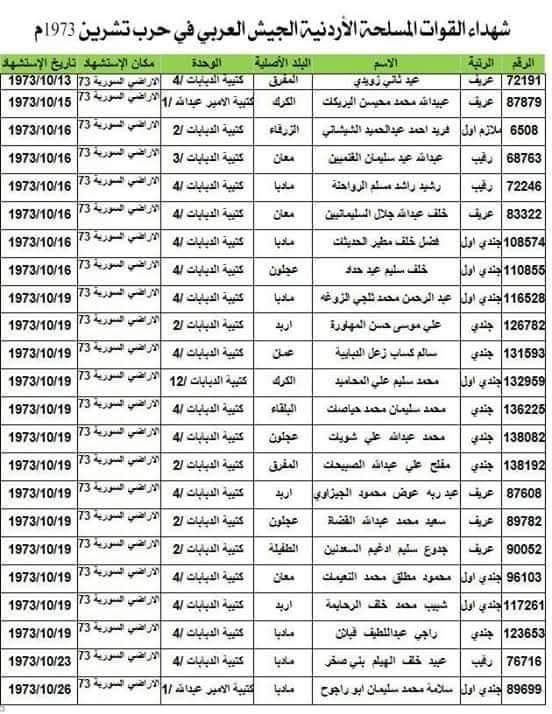 أسماء شهداء الجيش العربي الأردني في حرب تشرين 1973 التي روت أرض سوريا