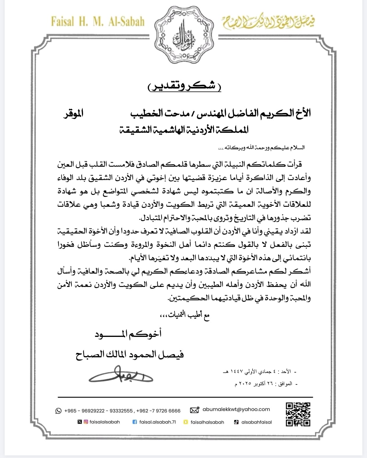 بعث سمو الشيخ فيصل الصباح برسالة شكر إلى المهندس مدحت الخطيب على مقاله المنشور في موقع نبأ الأردن الإخباري بعنوان:-