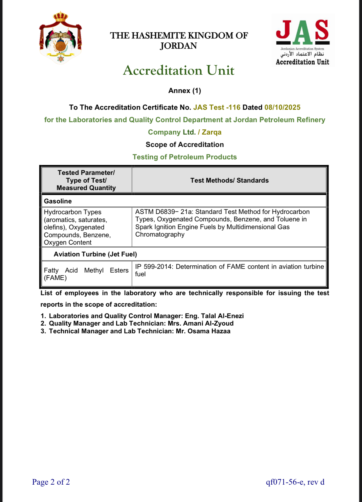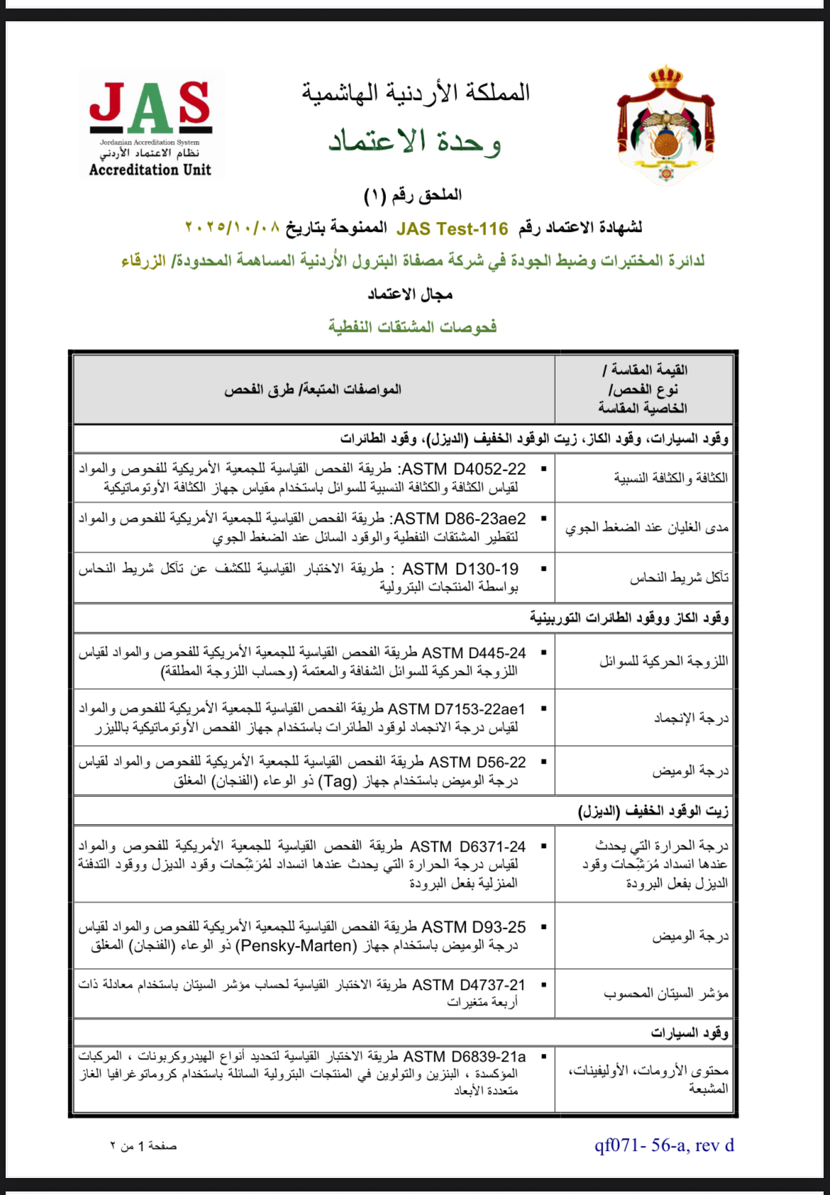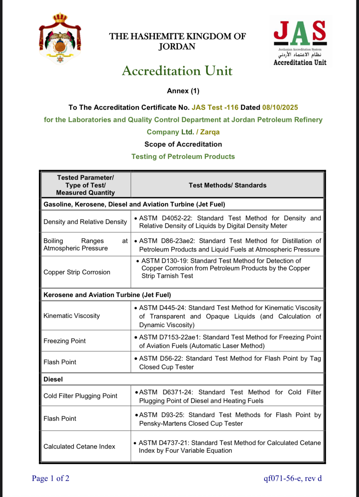 وجاء هذا الاعتماد بعد قيام وحدة الاعتماد - نظام الاعتماد والتقييس الأردني - بالتأكد من تطبيق المختبرات لمتطلبات المواصفة الدولية الايزو/ أييسي (ISO/IEC 17025:2017) في مجال فحوصات المشتقات النفطية، وبناءً عليه فإن تقارير الفحص الصادرة عن المختبر معترف بها دوليًا ومقبولة في جميع أنحاء العالم.