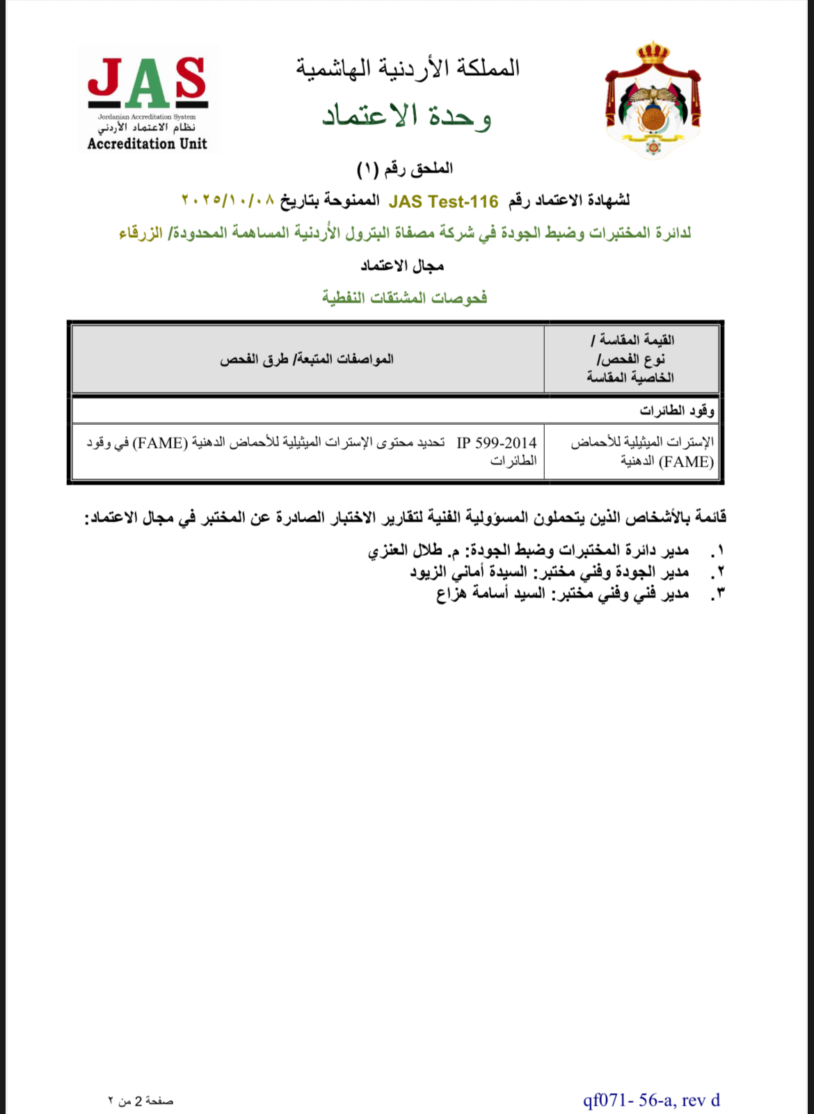 استكمال مختبرات شركة مصفاة البترول الأردنية متطلبات المواصفات الدولية للمشتقات النفطية وفق المواصفة الدولية (ISO/IEC 17025:2017)