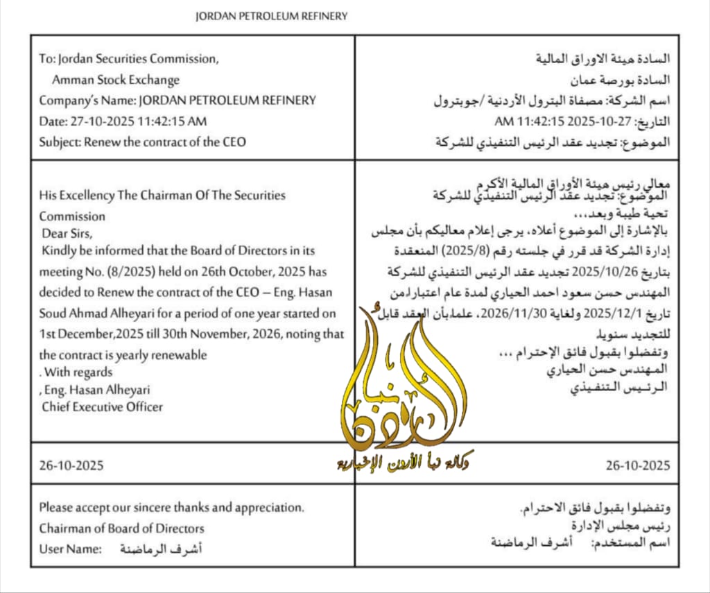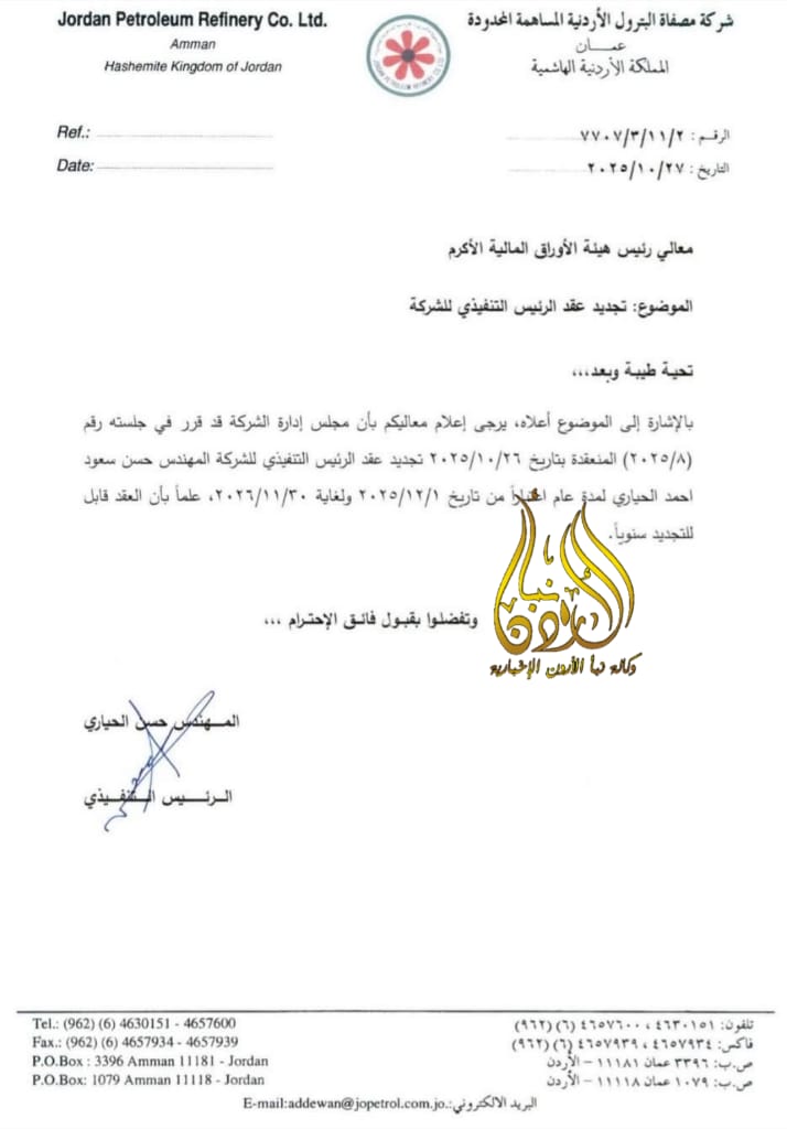 قرر مجلس إدارة شركة مصفاة البترول الأردنية في جلسته رقم (8/2025) المنعقدة بتاريخ 26 تشرين الأول 2025، تجديد عقد الرئيس التنفيذي للشركة المهندس حسن سعود أحمد الحياري لمدة عام واحد، اعتباراً من 1 كانون الأول 2025 ولغاية 30 تشرين الثاني 2026.