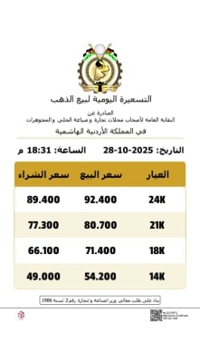وارتفعت أسعار الذهب لعيار 21 بمقدار نصف دينار في التسعيرة الأخيرة الصادرة عند الساعة 6:30 مساءً، مقارنةً بالتسعيرة السابقة الصادرة قبل نحو ساعتين.