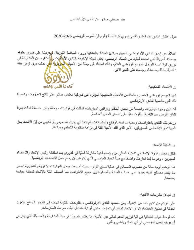 أعلن مجلس إدارة النادي الأرثوذكسي الأردني، اعتذاره الرسمي عن المشاركة في دوري كرة السلة للرجال للموسم الرياضي القادم 2025-2026.
