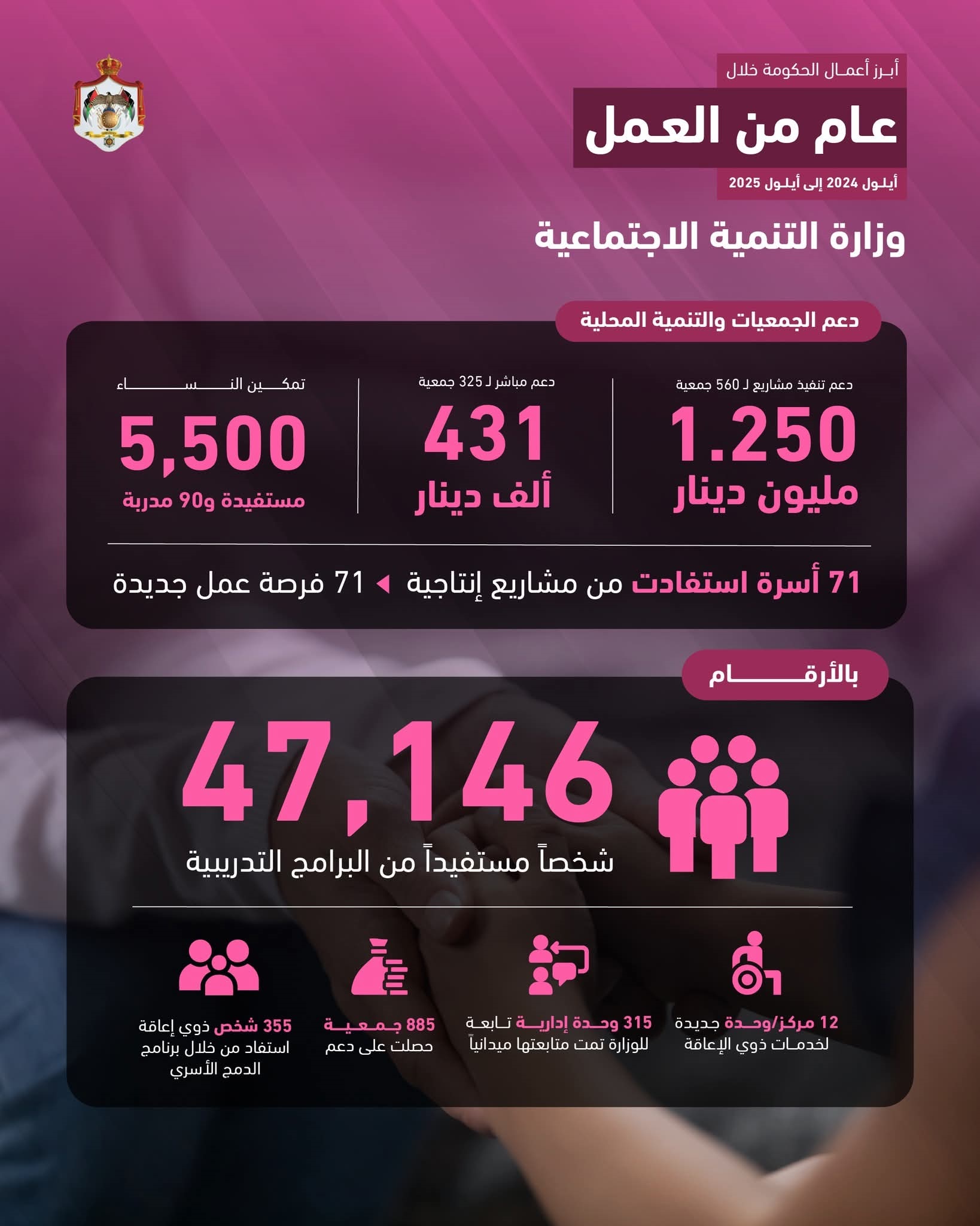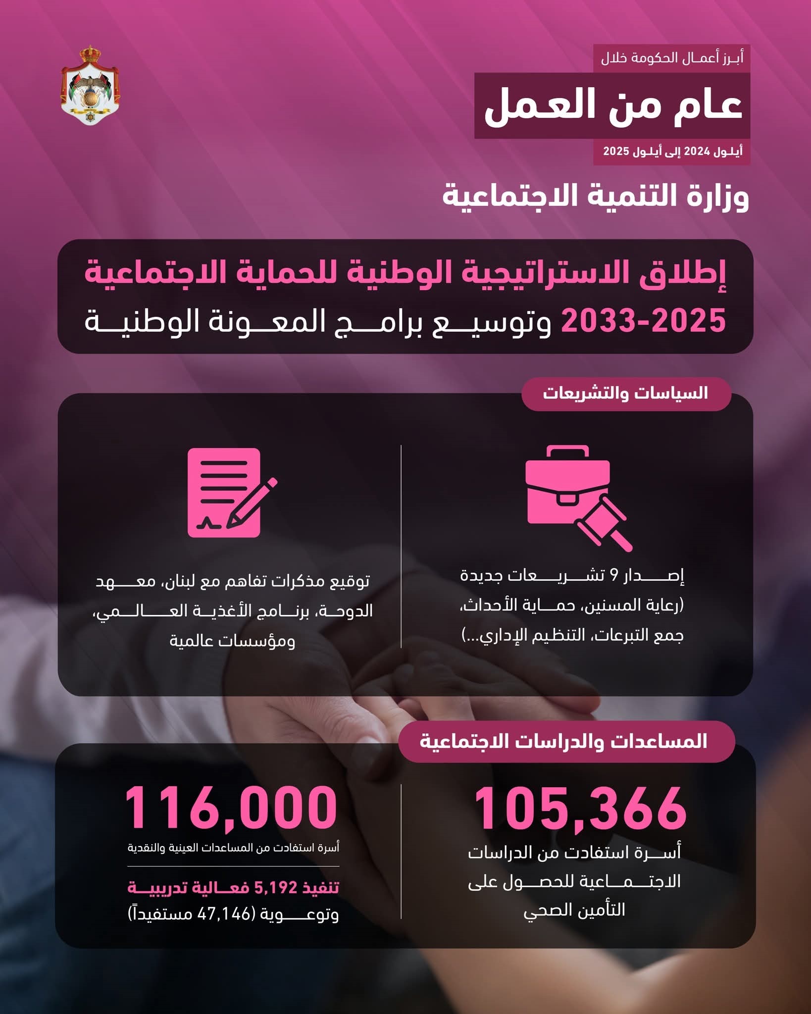 أظهرت بيانات حكومية أن وزارة التنمية الاجتماعية قدمت مساعدات عينية ونقدية لـ 116 ألف أسرة منذ أيلول 2024 وحتى أيلول 2025، ضمن جهودها لتعزيز الحماية الاجتماعية وتوسيع برامج المعونة الوطنية.