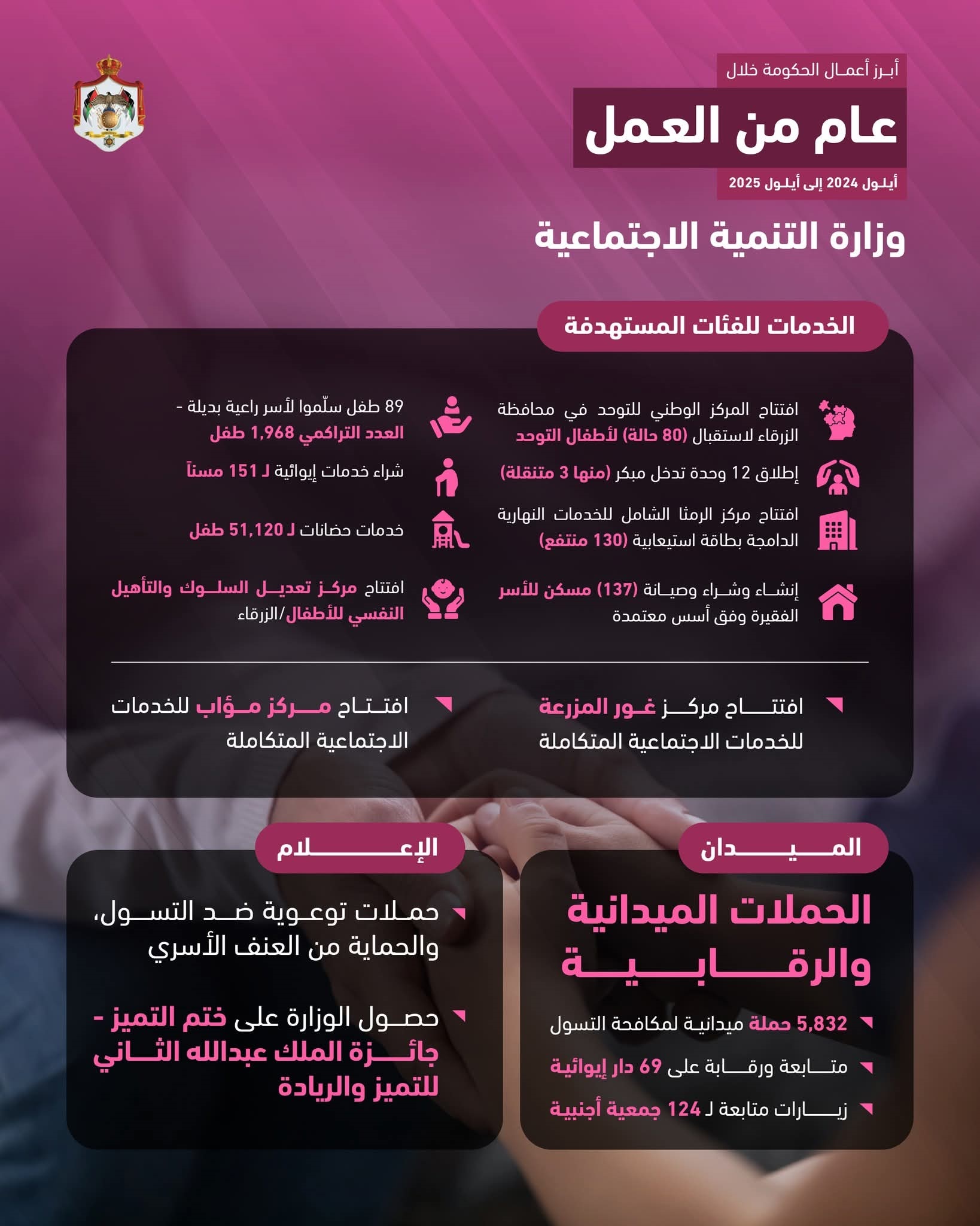 ونفذت الوزارة 5832 حملة ميدانية لمكافحة التسول، كما تابعت 69 دار إيواء وقامت بزيارات متابعة لـ 124 جمعية أجنبية، كما أطلقت حملات توعوية ضد التسول وللحماية من العنف الأسري، وحصلت على ختم التميز من جائزة الملك عبدالله الثاني للتميز والريادة.
