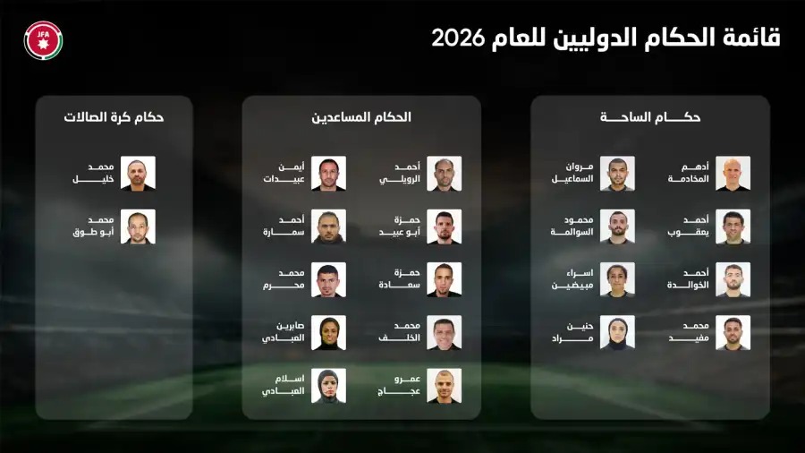 أعلن الاتحاد الأردني لكرة القدم، قائمة الحكام الدوليين للعام 2026، والتي ضمت 8 للساحة، 10 مساعدين، واثنين للصالات.