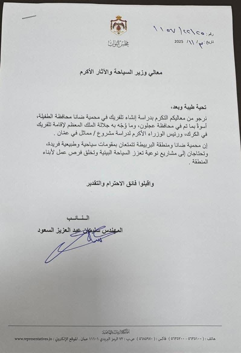وفي الإطار ذاته، تم التطرق إلى دعم المشاريع السياحية في محافظة الطفيلة، ومن أبرزها مشروع تلفريك محمية ضانا ومشاريع تطويرية أخرى في منطقة البربيطة، بما يعزز من مكانة المحافظة على الخريطة السياحية الوطنية.