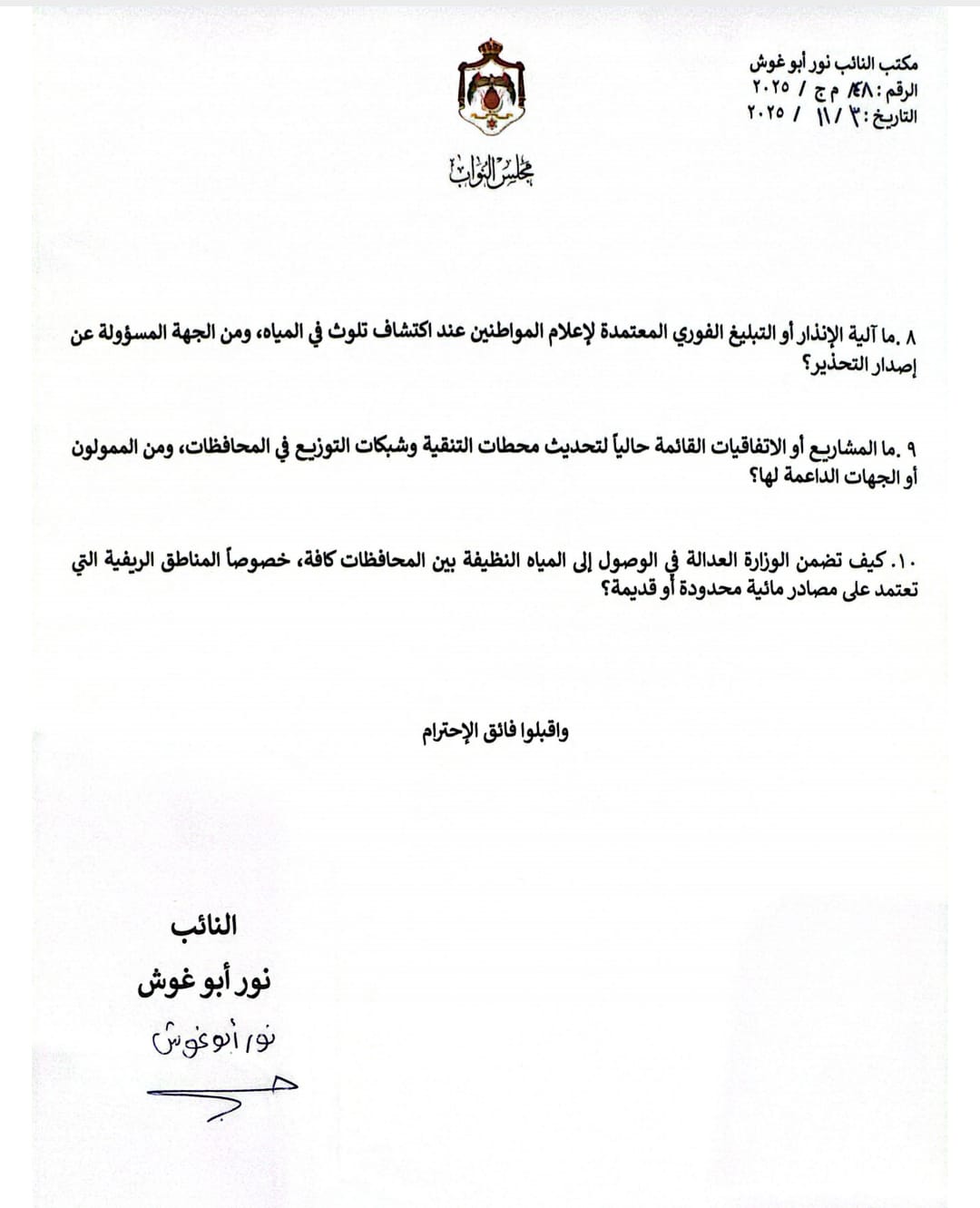 وختمت النائب نور أبو غوش سؤالها بالاستفسار عن المشاريع أو الاتفاقيات الجارية لتحديث محطات التنقية وشبكات التوزيع في المحافظات، ومن الجهات الممولة أو الداعمة لها، وعن الإجراءات التي تضمن العدالة في الوصول إلى المياه النظيفة بين جميع المحافظات، ولا سيما المناطق الريفية التي تعتمد على مصادر مائية محدودة أو قديمة.