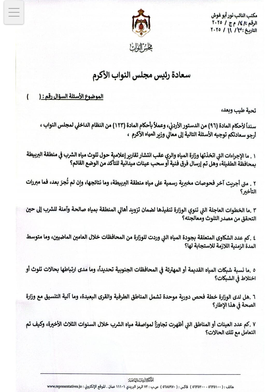 قدّمت النائب نور أبو غوش سؤالًا نيابيًا إلى رئيس مجلس النواب موجّهًا إلى وزير المياه والري، استنادًا لأحكام المادة (96) من الدستور الأردني والمادة (123) من النظام الداخلي للمجلس، طالبت فيه بتوضيح الإجراءات الحكومية المتخذة عقب انتشار تقارير إعلامية عن تلوث مياه الشرب في منطقة البربيطة بمحافظة الطفيلة.