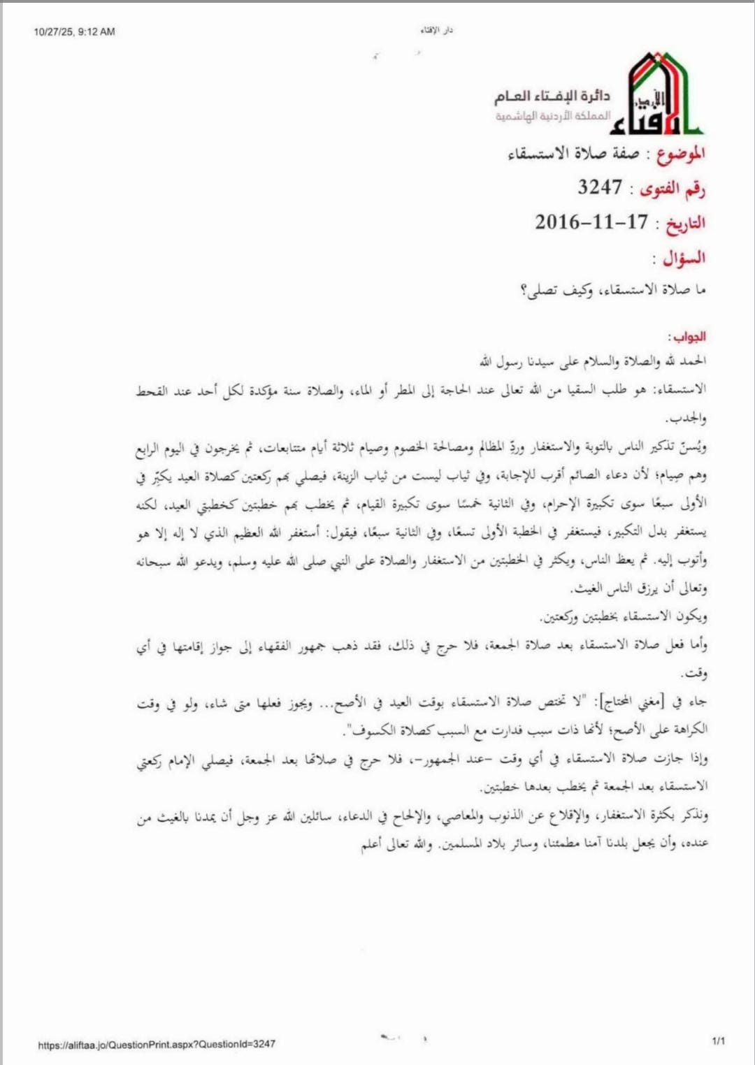 دعت وزارة الأوقاف والشؤون والمقدسات الإسلامية المواطنين إلى أداء صلاة الاستسقاء يوم الجمعة القادم، في جميع مناطق المملكة، احياءً للسنة النبوية الشريفة.