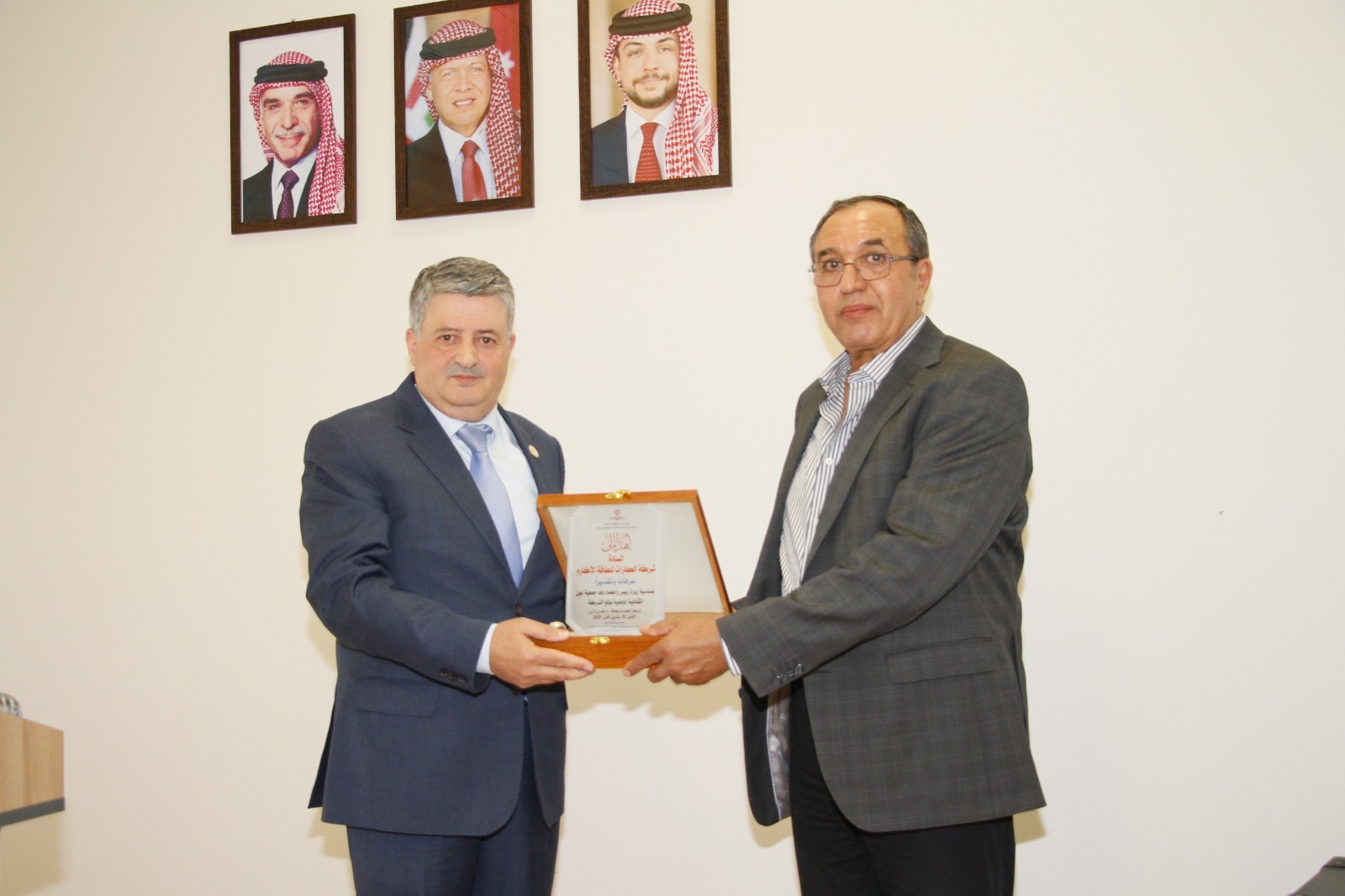وفي نهاية الزيارة تبادل المهندس محمد المعايطة عضو مجلس إدارة شركة العطارات للطاقة واسعد ابراهيم ناجي العزام رئيس هيئة إدارة جمعية عَون الثقافية الوطنية الدروع التذكارية