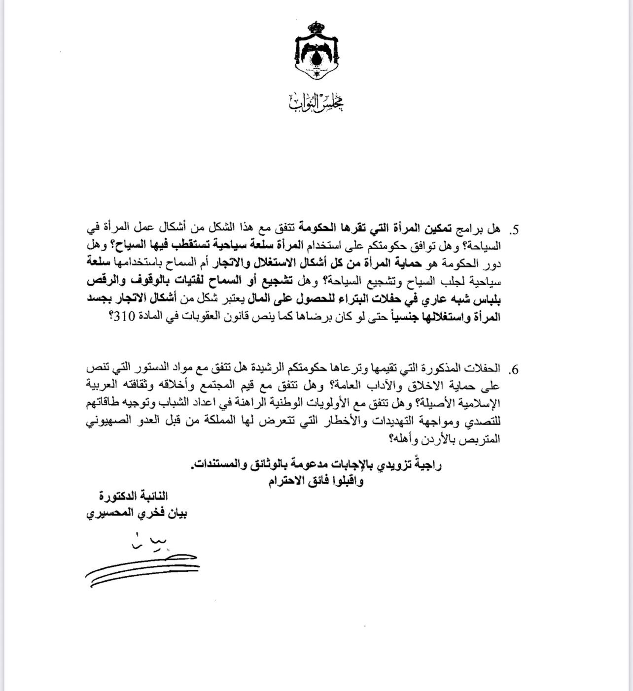 وأشارت المحسيري في سؤالها إلى أن بعض الحفلات التي تُنظمها جهات حكومية مثل وزارتي السياحة والثقافة وهيئة تنشيط السياحة وسلطتي البترا والعقبة، تستضيف فتيات مغنيات أو راقصات بملابس لا تتناسب مع قيم المجتمع، متسائلة عمّا إذا كان ذلك يُعد شكلًا من أشكال الاستغلال أو الاتجار بالبشر، في مخالفة لأحكام الدستور وقانوني العقوبات والاتجار بالبشر، وللقيم الدينية والأخلاقية التي يقوم عليها المجتمع الأردني.