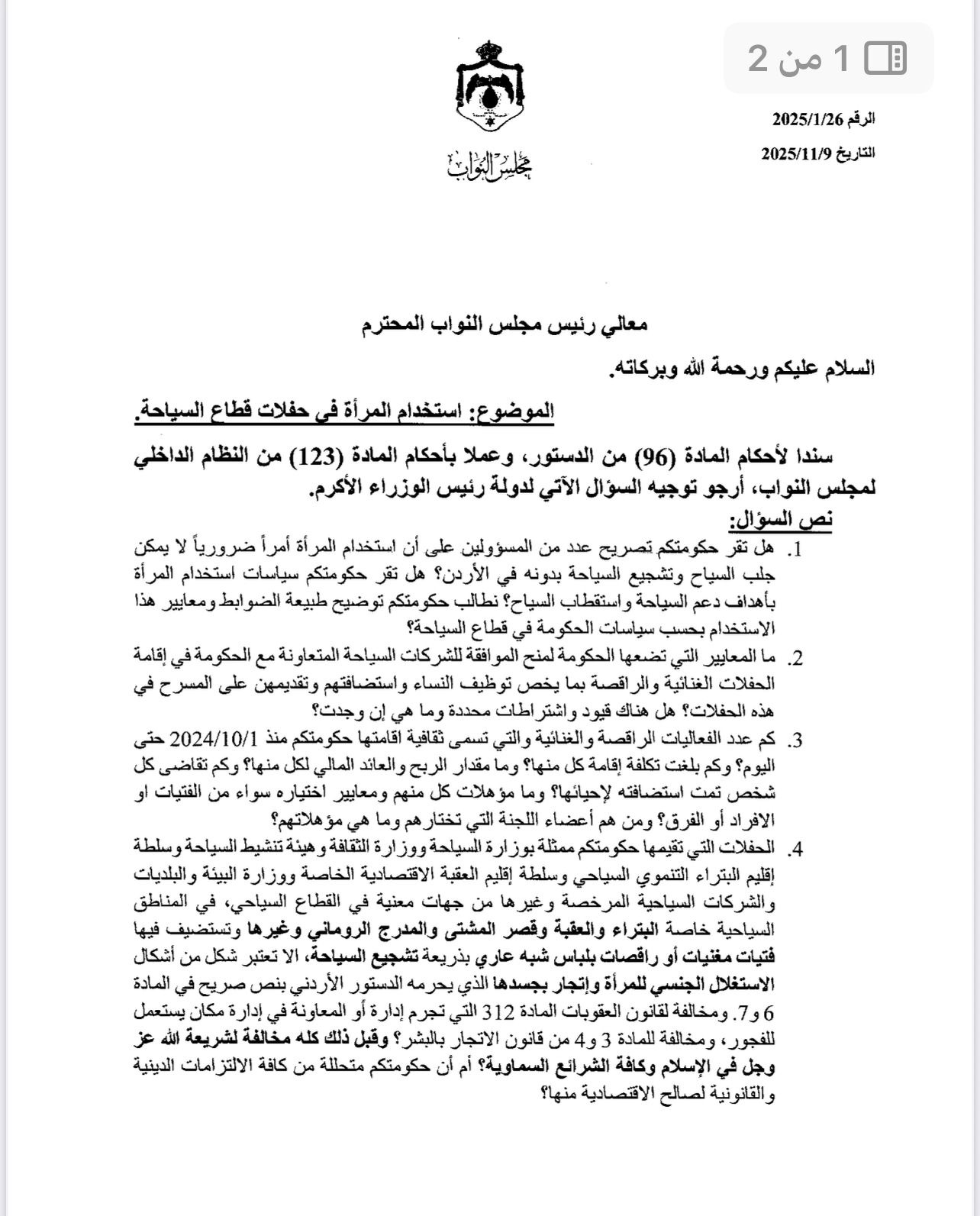 كما تساءلت في ختام سؤالها عن مدى انسجام برامج تمكين المرأة الحكومية مع هذا الشكل من العمل في القطاع السياحي، وهل يُعدّ توظيف المرأة في هذه الحفلات تمكينًا اقتصاديًا أم استغلالًا تجاريًا، مؤكدة ضرورة التزام الحكومة بحماية المرأة من جميع أشكال الاستغلال والاتجار.