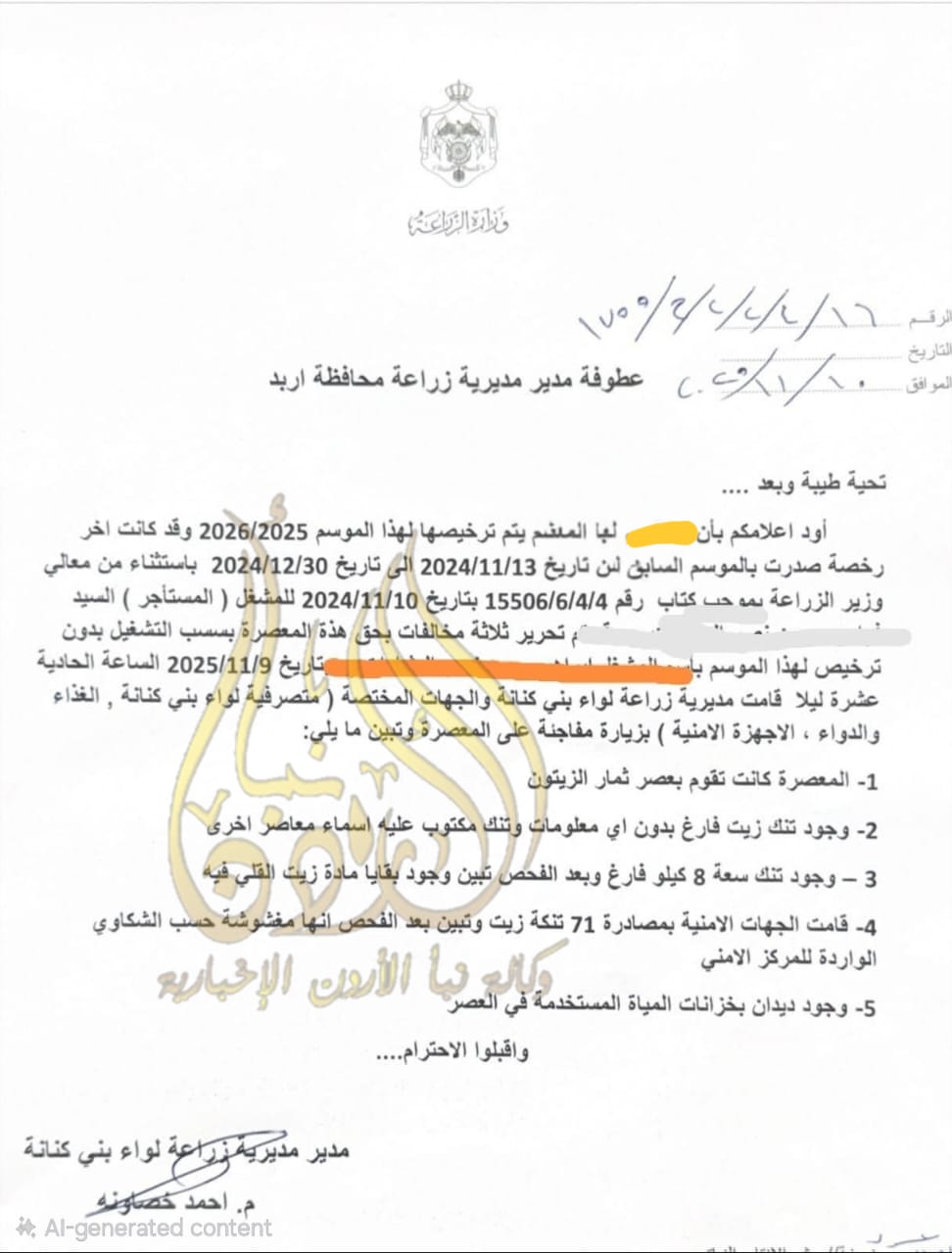 بعد أن قامت مديرية زراعة لواء بني كنانة بزيارة مفاجئة إلى معصرة وتبين ان المعصرة كانت تقوم بعصر ثمار الزيتون، فقد تبين حسب وثيقة، أن الأمر لم يقف عند حد الغش فحسب، بل تبين وجود ديدان بخزانات المياة المستخدمة في العصر.