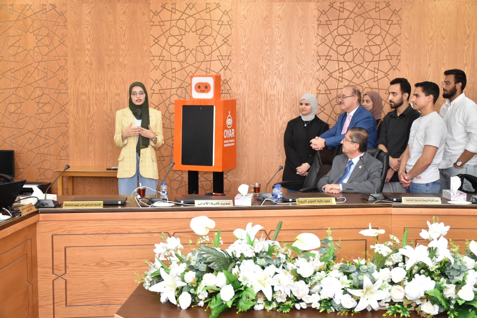 وخلال الزيارة، تم عقد لقاء مع مجموعة من طلبة "مختبر اورانج اليرموك الإبداعي OYIL ، عرض خلاله الطلبة مشروعهم الابتكاري المتمثل في إعداد روبوت ذكي مخصص لعرض الإعلانات بطريقة تفاعلية ومبتكرة، نفذه الطلبة بدعم من كلية الحجاوي للهندسة التكنولوجية ومختبر" اورانج اليرموك الإبداعي" في مركز الريادة والابتكار.