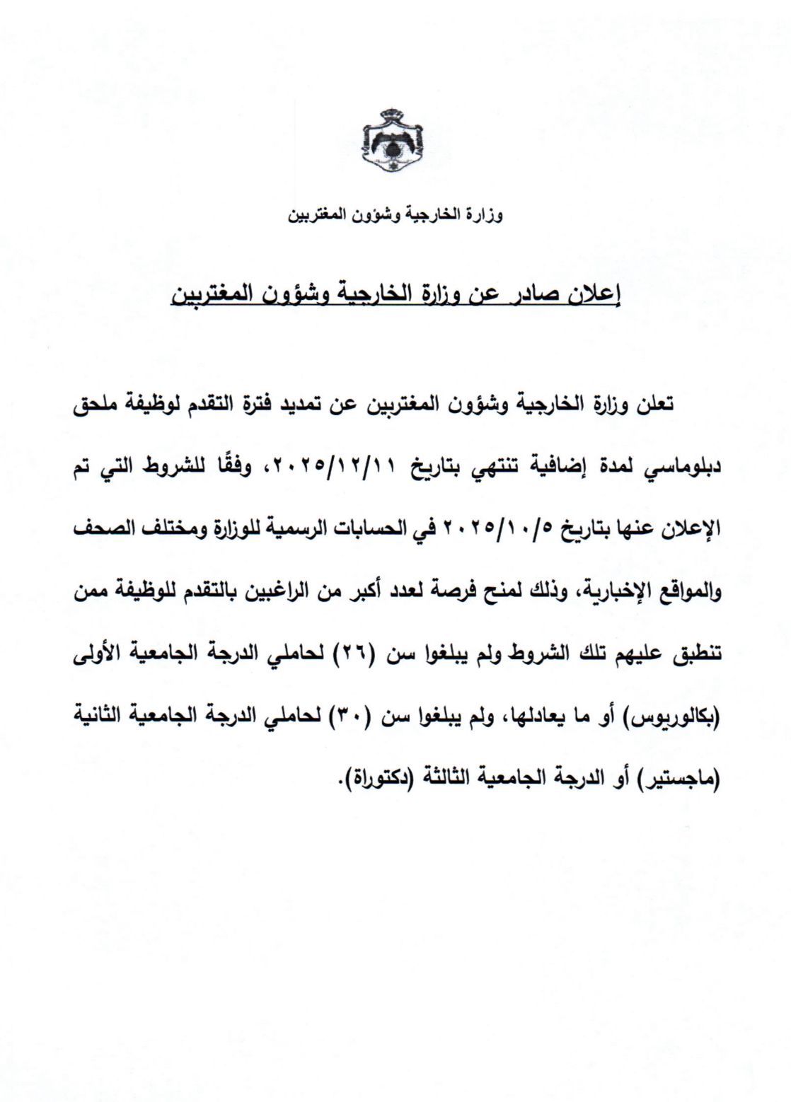 تعلن وزارة الخارجية وشؤون المغتربين عن تمديد فترة التقدّم لوظيفة ملحق دبلوماسي، وذلك حتى تاريخ ١١ كانون الأول ٢٠٢٥، وفقًا للشروط المعلنة بتاريخ ٥ تشرين الأول ٢٠٢٥ في الحسابات الرسمية للوزارة والصحف والمواقع الإخبارية.