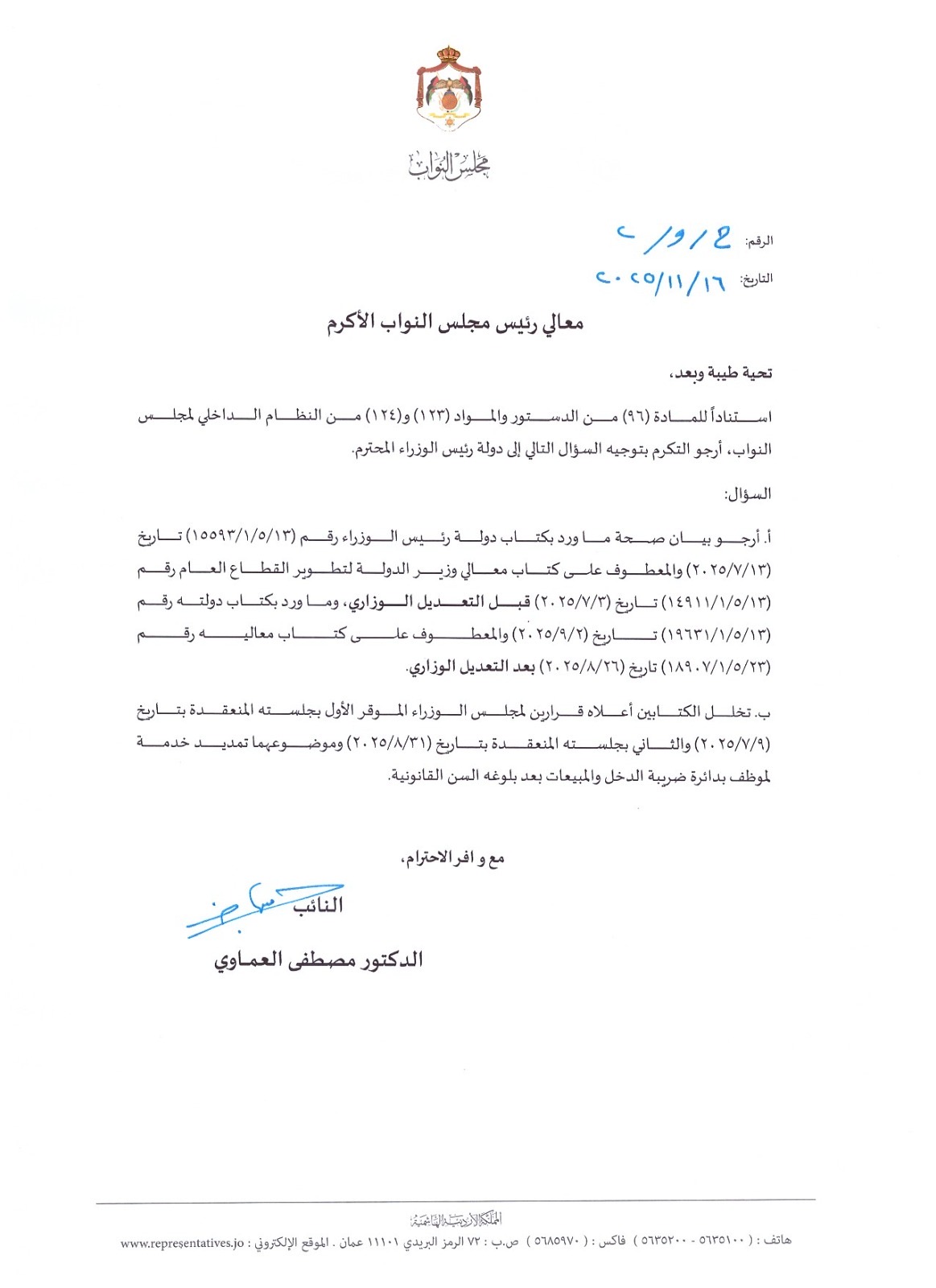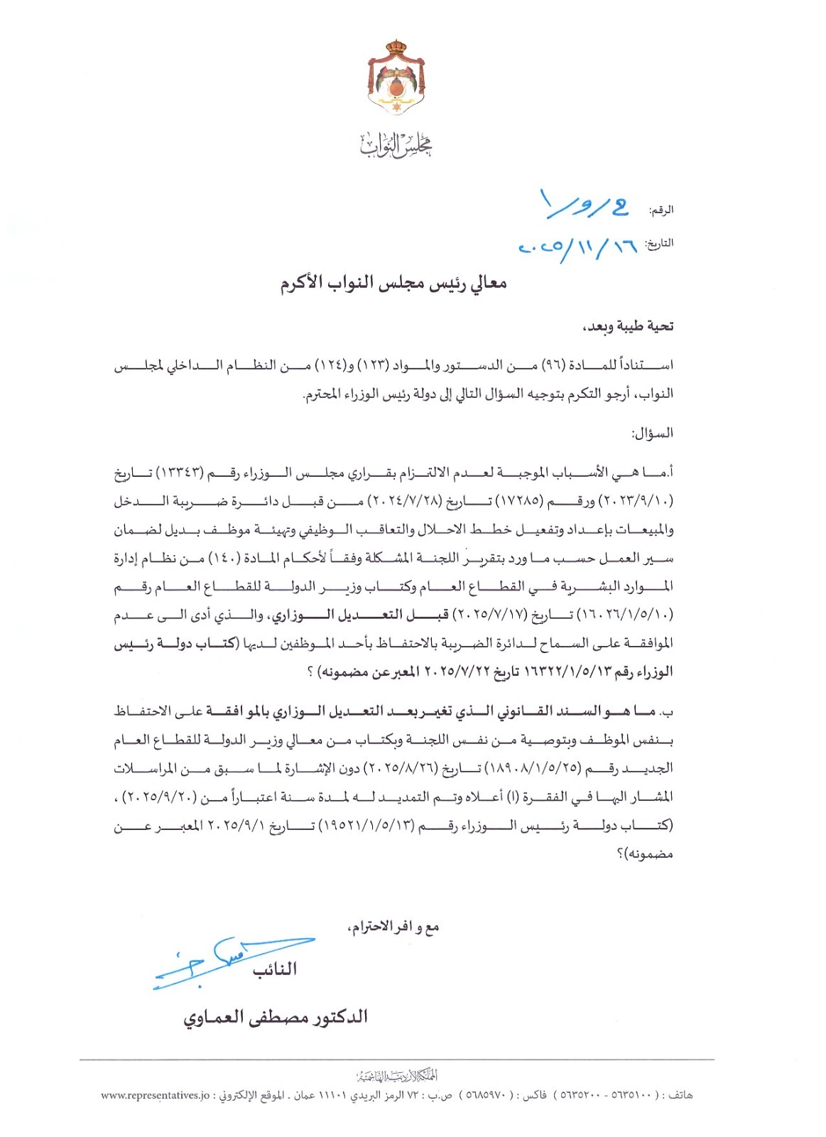 وجه النائب الدكتور مصطفى العماوي استفسارين إلى دولة رئيس الوزراء، يتعلقان بتمديد خدمة موظف في دائرة ضريبة الدخل والمبيعات بعد بلوغه السن القانونية، وذلك استناداً إلى نصوص الدستور والنظام الداخلي لمجلس النواب.