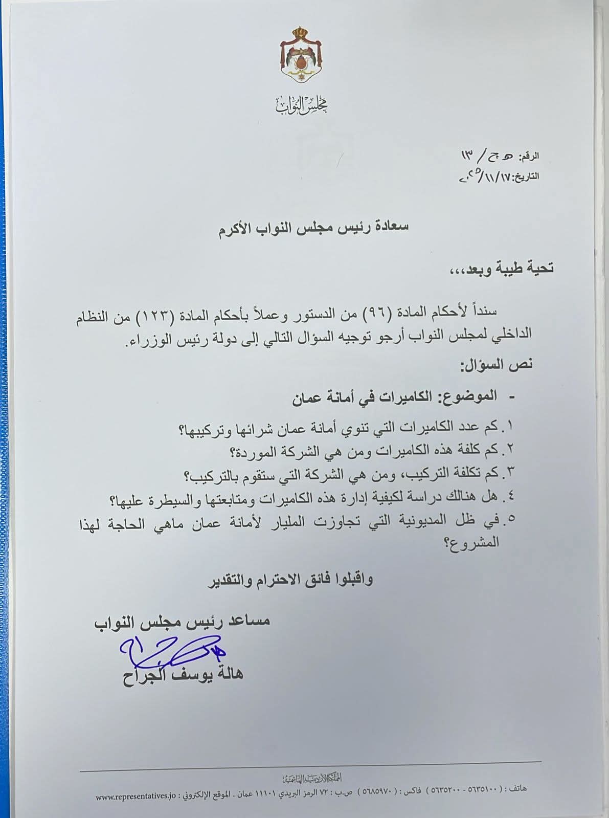 قدّمت مساعد رئيس مجلس النواب، النائب هالة الجراح، سؤالاً رسمياً إلى دولة رئيس الوزراء حول مشروع تركيب الكاميرات في أمانة عمّان، وذلك استنادًا لأحكام المادة (96) من الدستور والمادة (23) من النظام الداخلي لمجلس النواب.