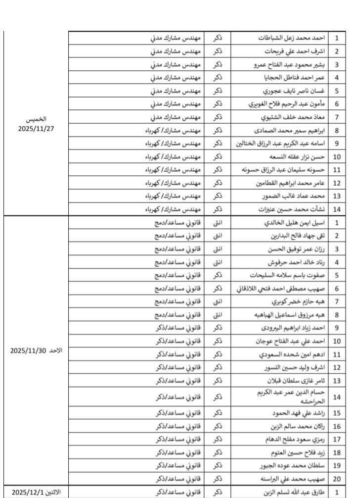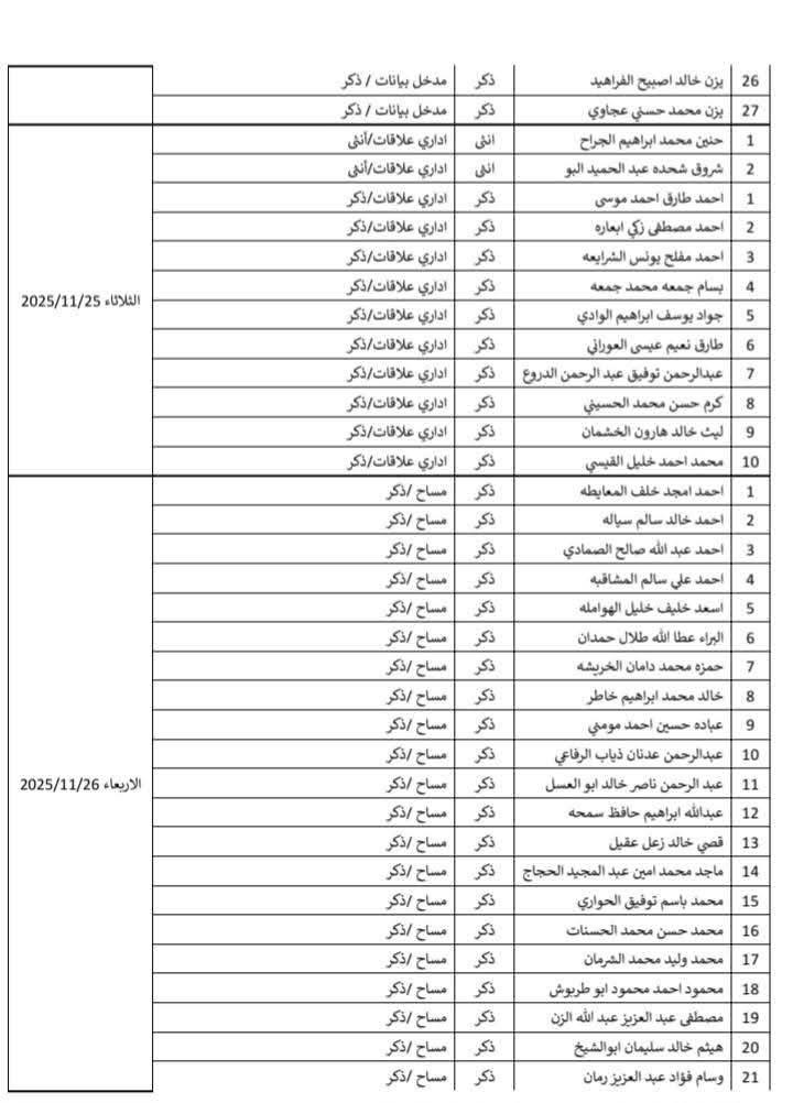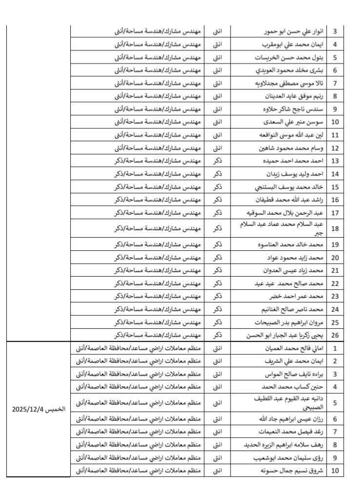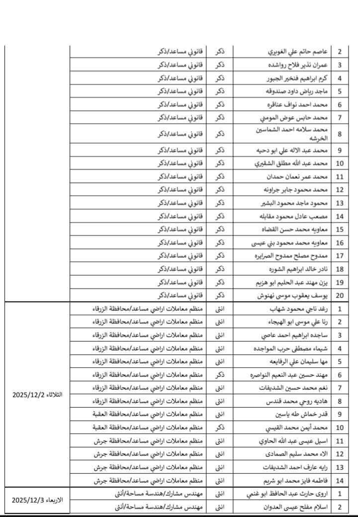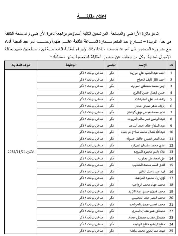 دعت دائرة الأراضي والمساحة المرشحين الواردة أسماؤهم في الكشف المرفق لمراجعة دائرة الأراضي والمساحة الكائنة في جبل اللويبدة ـ شارع عبد المنعم سمارة، وذلك لإجراء المقابلة الشخصية في الساعة الثانية عشرة ظهرًا يوم الاثنين الموافق 2025/11/24.