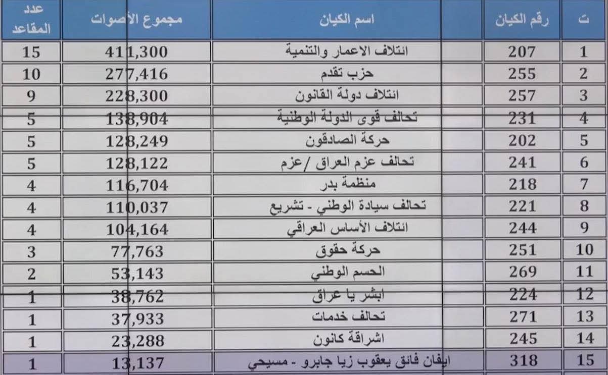 وبالمجمل حصلت التحالفات والقوائم الشيعية على 187 مقعدا، والسنية على 77 مقعدا، والكردية على 56 مقعدا، إضافة إلى 9 مقاعد للكوتا.