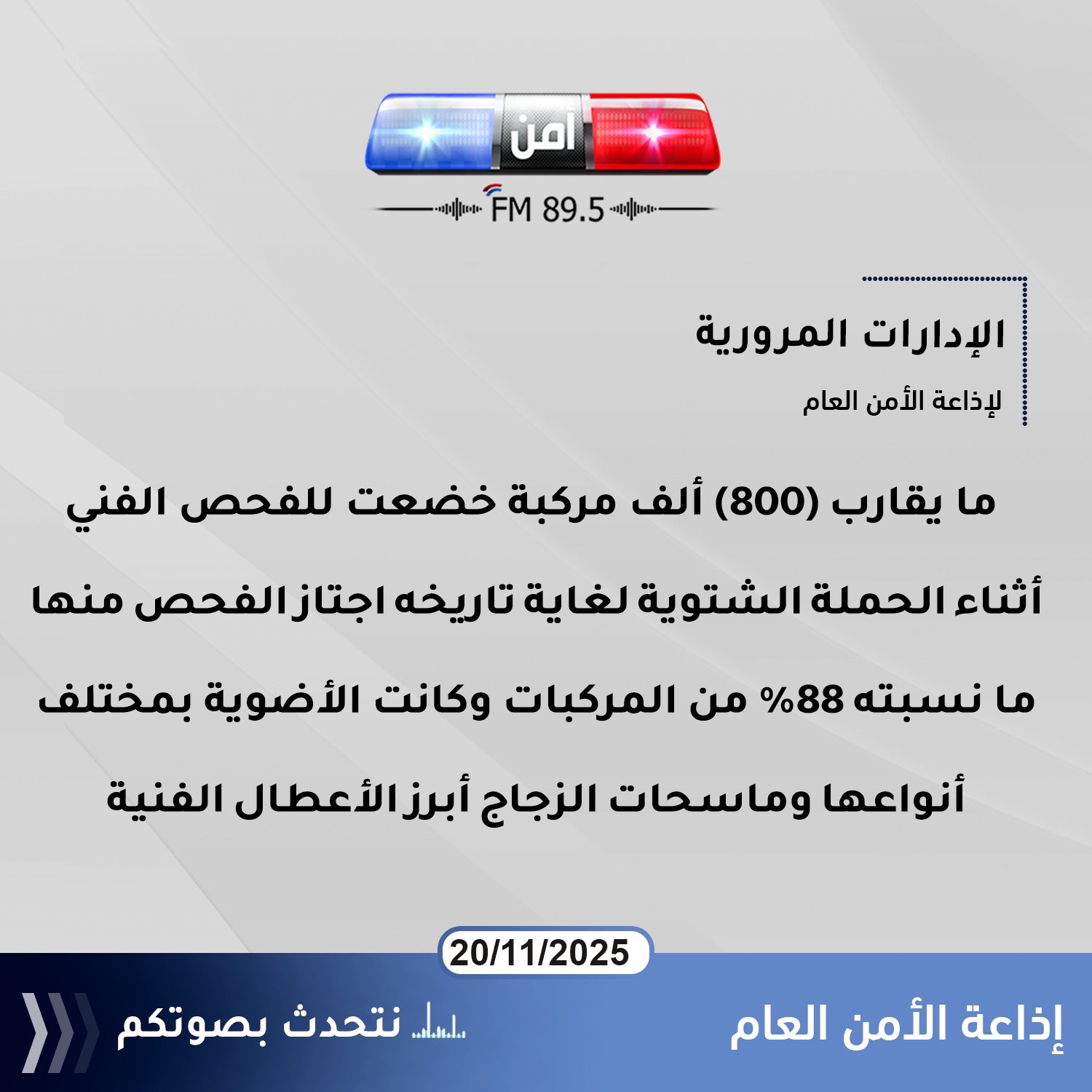أكد ضباط عمليات الإدارات المرورية على أن (800) ألف مركبة قد خضعت للفحص الفني خلال الحملة الشتوية لغاية تاريخه اجتاز الفحص منها بنجاح (709) ألف مركبة مما يدل على الاهتمام والمتابعة المستمرة للمواطنين لمركباتهم حفاظا على سلامتهم وسلامة باقي مستخدمي الطريق.