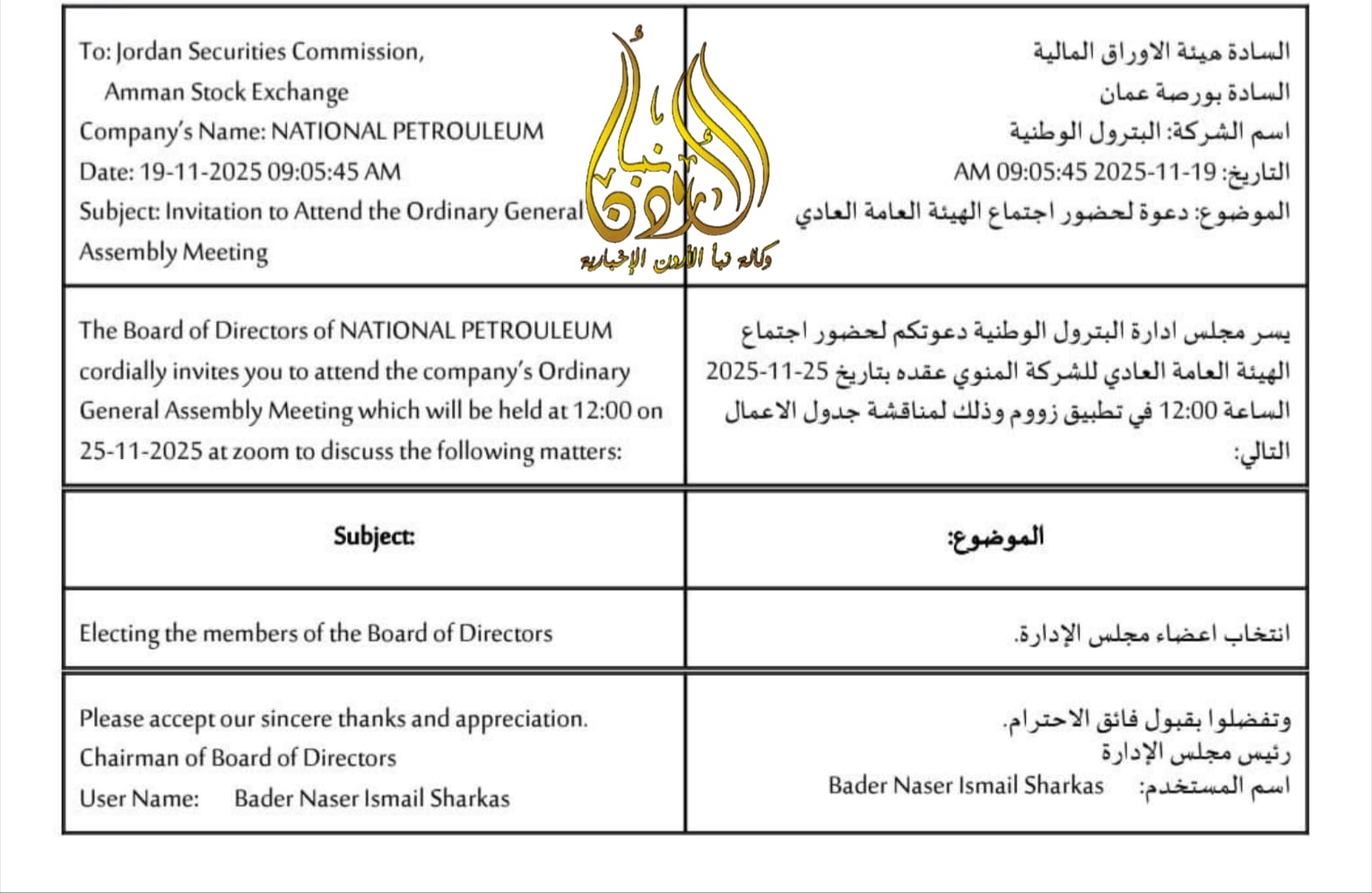 دعا مجلس إدارة البترول الوطنية، مساهميه، لحضور اجتماع الهيئة العامة العادي للشركة المنوي عقده بتاريخ 2025-11-25 الساعة 12:00 عبر وسيلة الاتصال المرئي والالكتروني Zoom لمناقشة جدول الاعمال وانتخاب مجلس ادارة جديد.