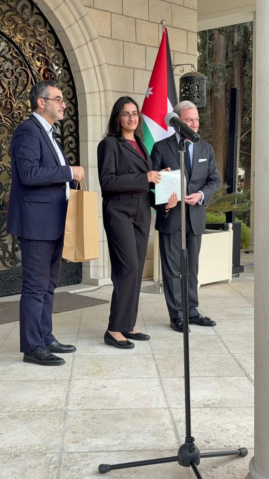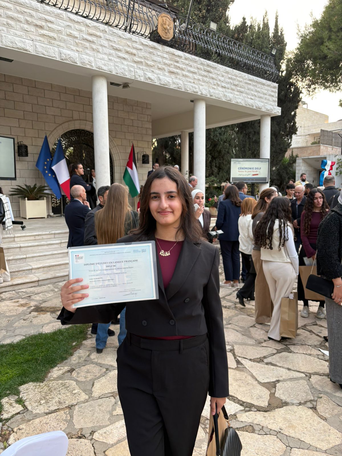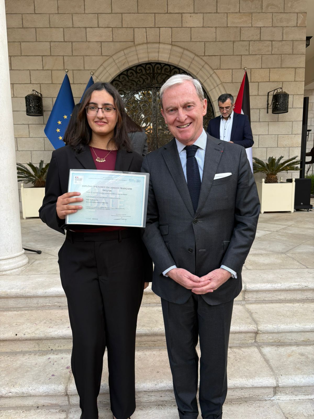 كرم السفير الفرنسي في عمان فرانك جيليه الطالبة لمار اسامه الراميني يوم الاثنين الموافق 17/11/2025 للمرة الثانية على التوالي تقديراً لتميزها ونجاحها الباهر وتفوقها في امتحان اللغة الفرنسية .