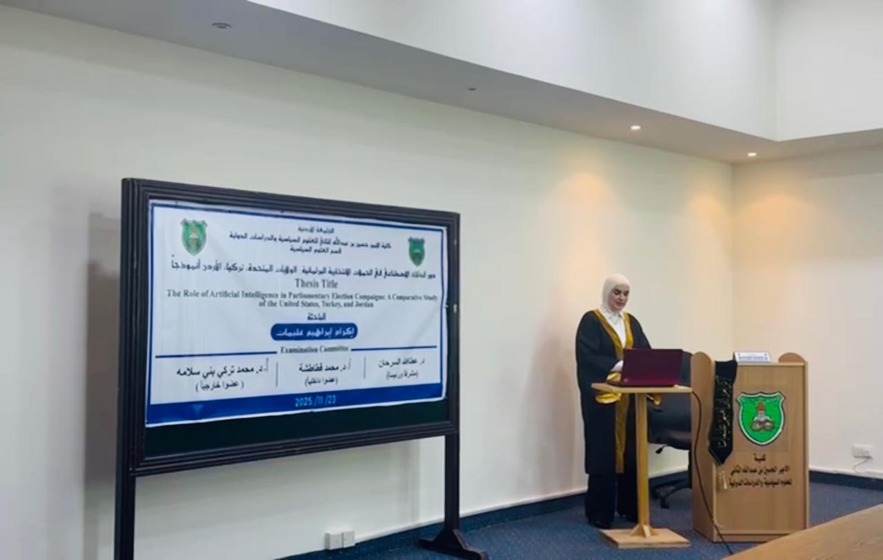 وقد جرت أمس مناقشة أول رسالة ضمن البرنامج للطالبة إكرام إبراهيم عليمات تحت عنوان (دور الذكاء الاصطناعي في الحملات الانتخابية البرلمانية، الولايات المتحدة، الأردن نموذجاً) في حدث يعكس الإنتاج العلمي للبرنامج ونجاحه في تحويل الخبرات العملية المتراكمة في الهيئة إلى محتوى أكاديمي ممنهج يخدم تطوير العملية الانتخابية في الأردن.