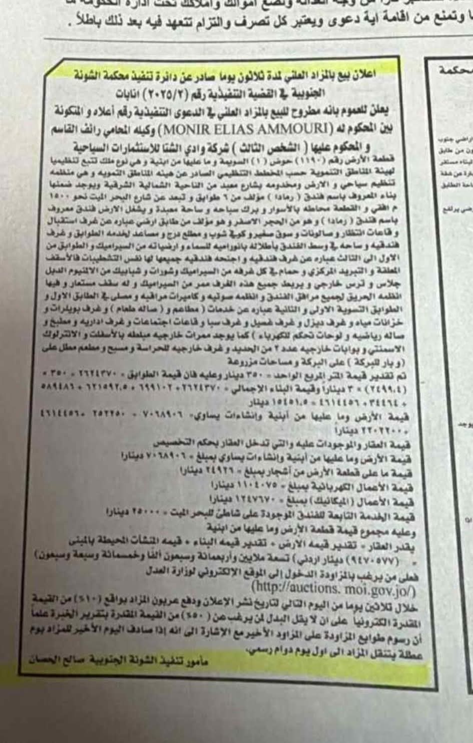 اعلان بيع فندق رمادا البحر الميت بالمزاد العلني