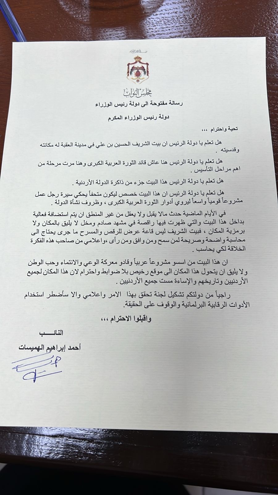 وأضاف في رسالته أن ما جرى داخل البيت يُعدّ "غير منطقي وغير مقبول”، مشيراً إلى أن الفعالية الأخيرة أظهرت المكان بصورة لا تليق به، وأن تحويله إلى قاعة لعرض أنشطة لا تنسجم مع قيم الأردنيين أمر مرفوض.