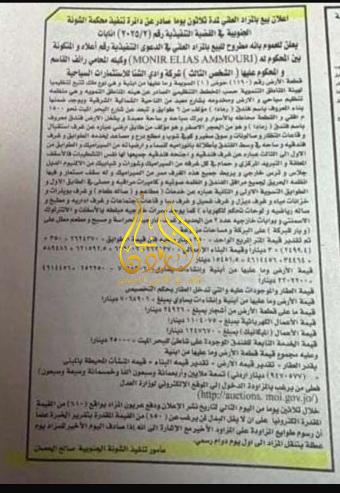 شركة وادي الشتا ترد على إعلان طرح فندق رمادا البحر الميت للبيع في المزاد العلني (إفصاح)