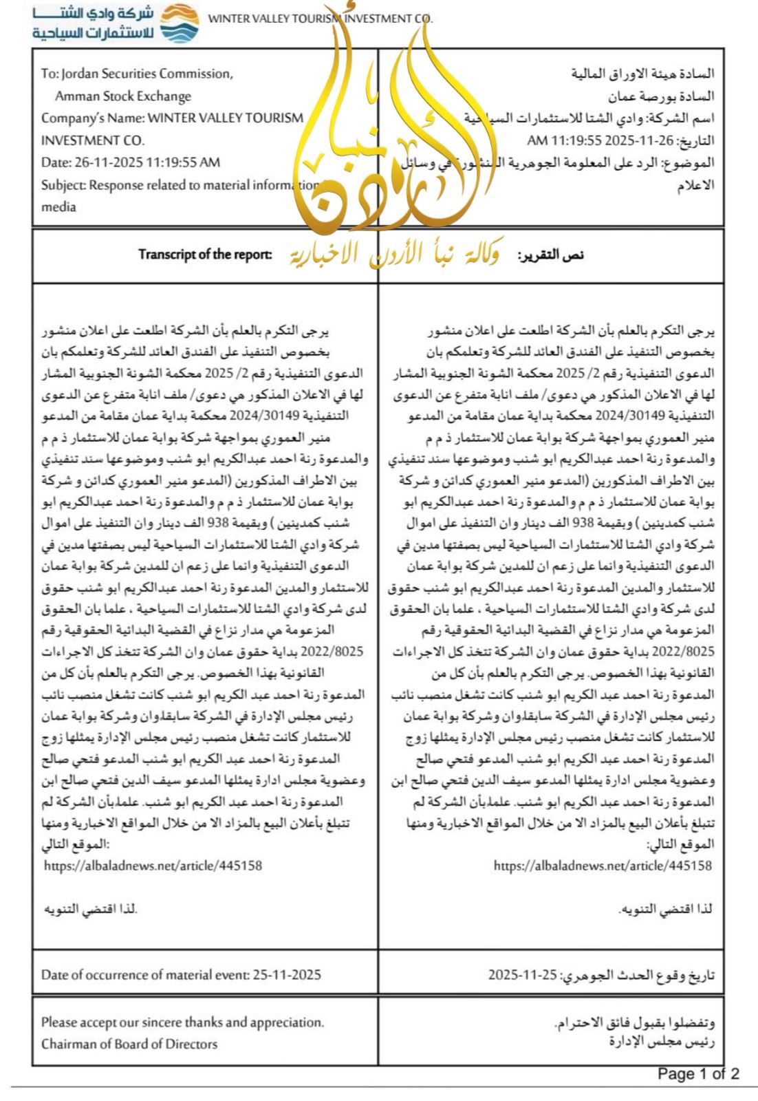 أصدرت شركة وادي الشتاء للاستثمارات السياحية توضيحاً حول إعلان متداول عبر وسائل الإعلام يتعلق بدعوى تنفيذية على الفندق العائد للشركة