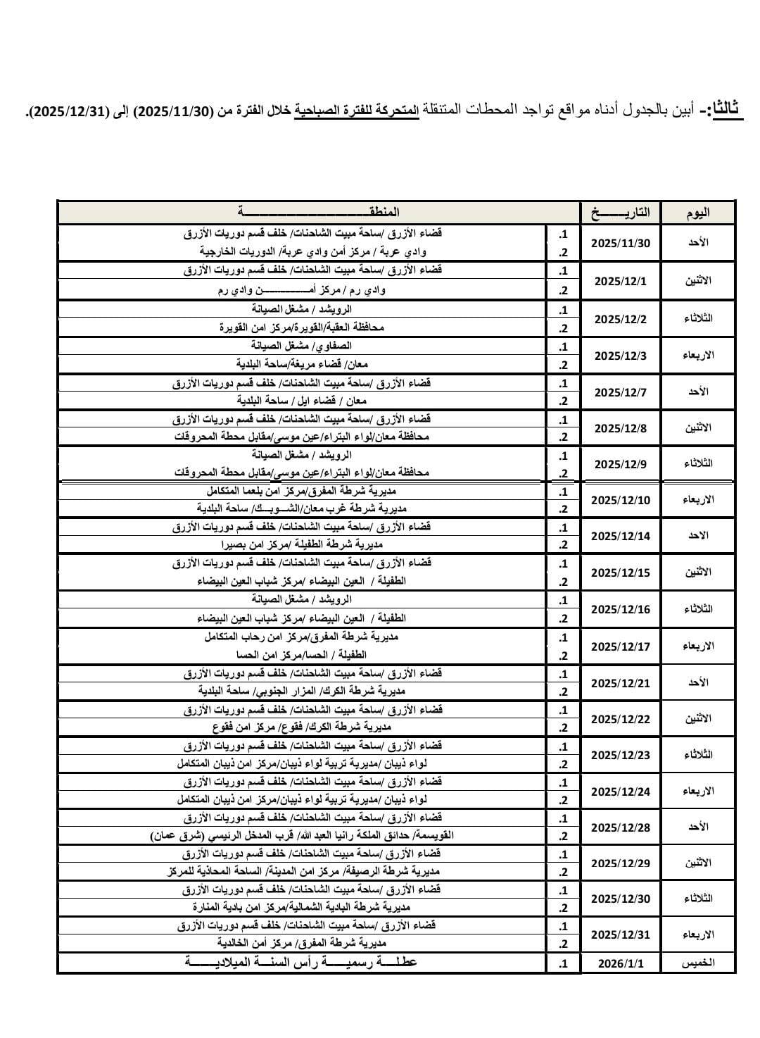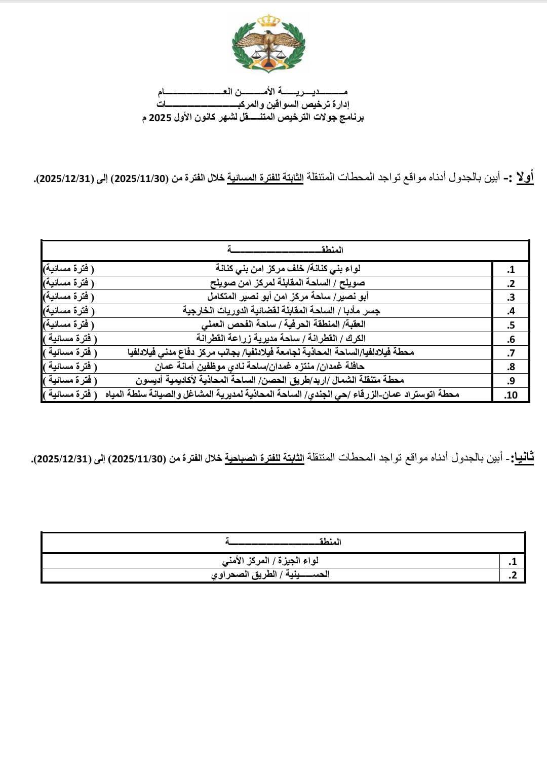 تعلن إدارة ترخيص السواقين والمركبات عن مواعيد العمل بجولات الترخيص المتنقل والمسائي ضمن المبادرة الابتكارية ( بنوصلك ) خلال شهر كانون الأول لعام 2025 في عدد من مناطق المملكة.